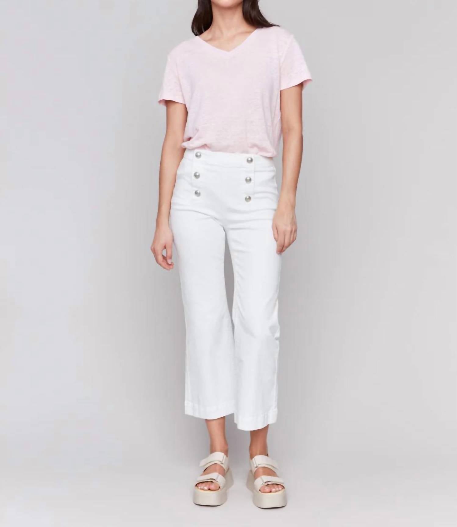 Introducing the Cropped Pull-on Flare Jeans by Charlie B, a chic addition to your wardrobe in a timeless white hue. These jeans are crafted from a cotton blend with stretch denim material, offering a flattering flare fit and a cropped length that complements your spring and summer style. Designed in a regular rise waist with convenient pull-on closure, they feature front button details and practical pockets. Machine wash and line dry. With a 26-inch inseam, these jeans promise comfort and a vintage flair perfect for any occasion. 97% Cotton and 3% Spandex.