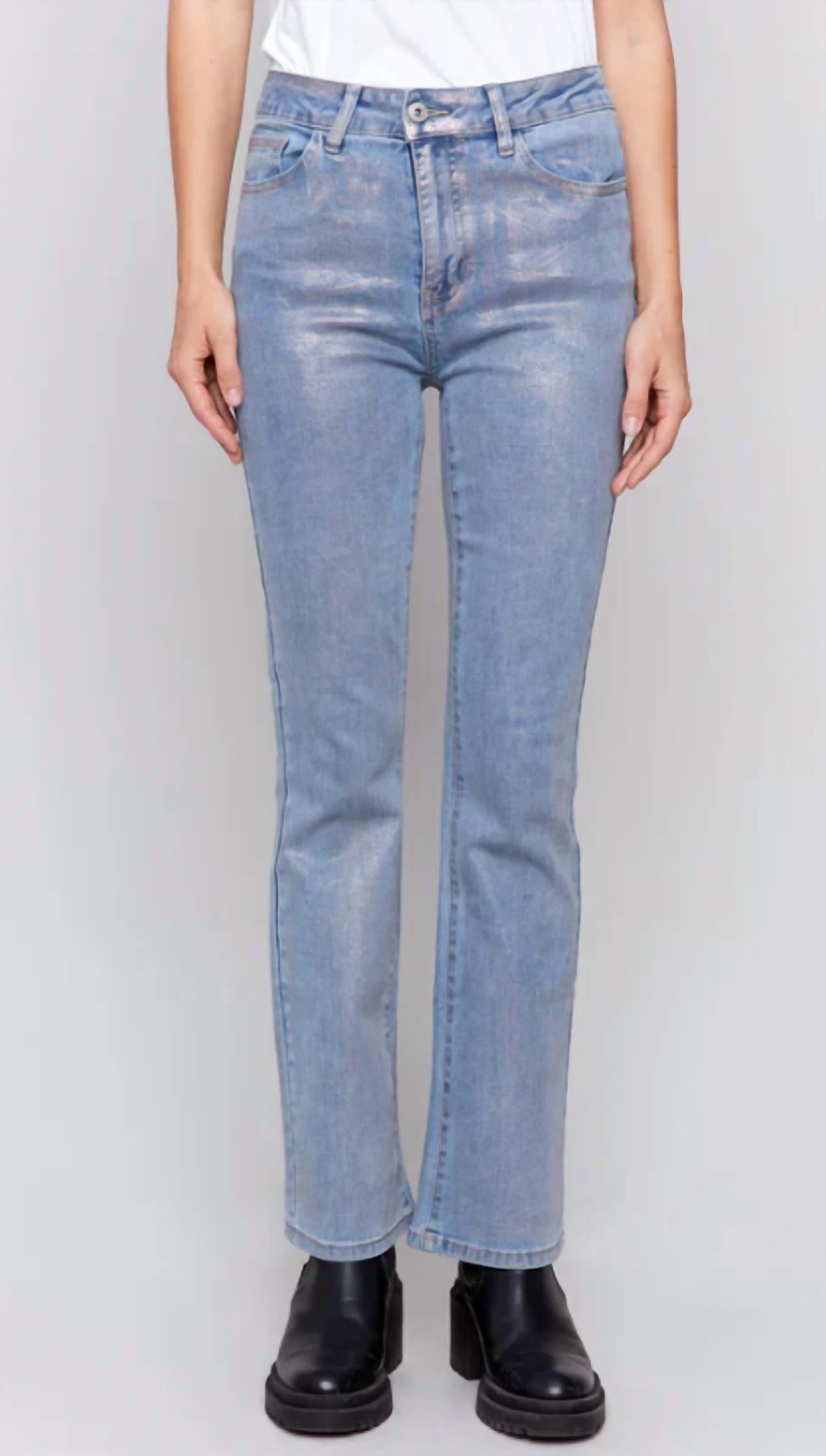 If you're looking for boot-cut, this is the jean for you. Step up your denim game with these foiled bootcut jeans in stunning silver blue. The mid-rise and bootcut leg offer a flattering fit, while the foiled finish gives a chic, metallic sheen that adds a trendy touch to your outfit. Made from a comfortable and durable blend of fabrics, these jeans will become a versatile staple in your fall wardrobe. Perfect for a night out or a stylish daytime look.
