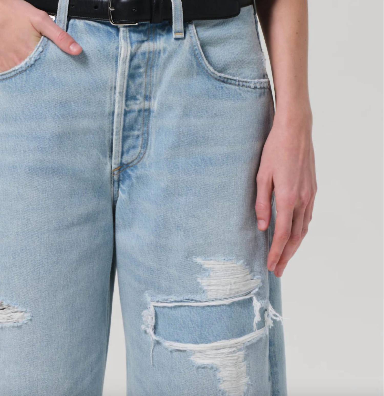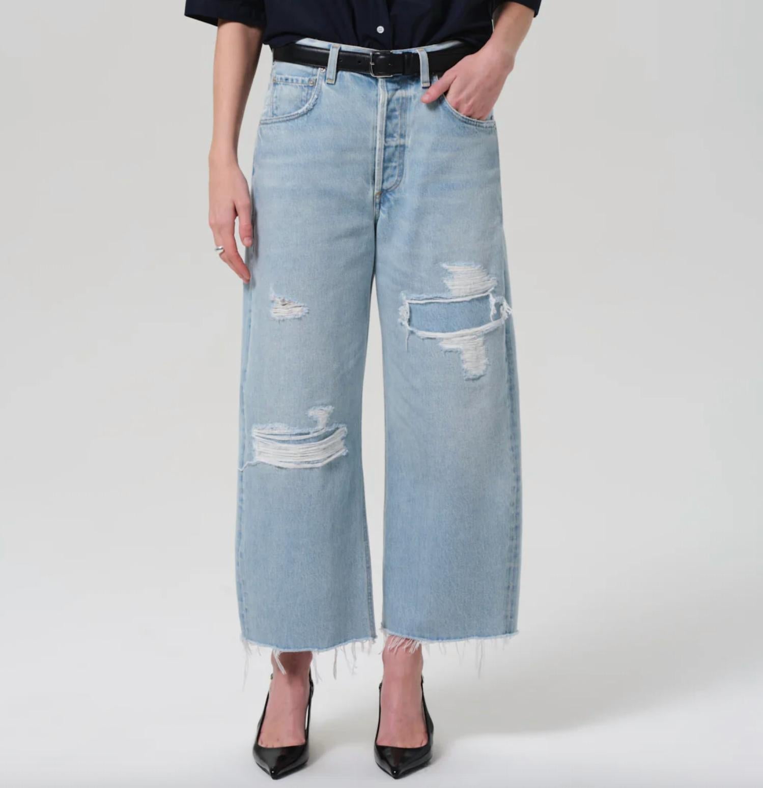 Pair these wide leg jeans with mules, slides or your favorite strappy sandals. Presenting the Ayla Raw Hem Crop Jeans from Citizens of Humanity, a quintessential summer staple embodying both style and sustainability. Crafted from 100% regenerative cotton, these light indigo denim jeans feature a relaxed fit with a wide leg and a flattering crop, accented by fading, whiskering, and a raw hem for that vintage-inspired touch. The button fly closure complements the 12 1/2" rise and 25" inseam, perfect for laid-back streetwear or an upscale dinner party look when paired with heels and a blazer. Embrace comfort and effortless chic with this versatile addition to your wardrobe.
