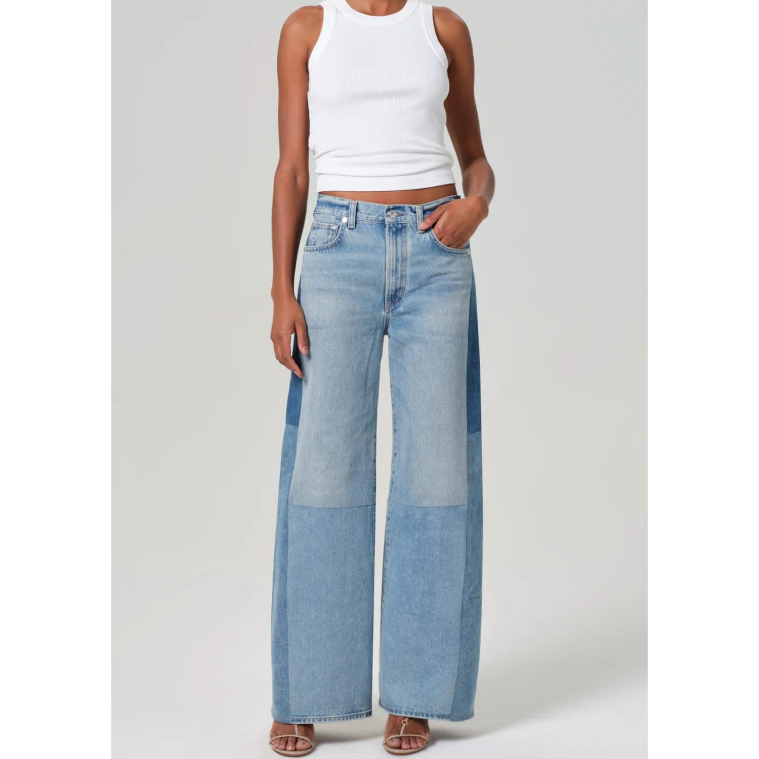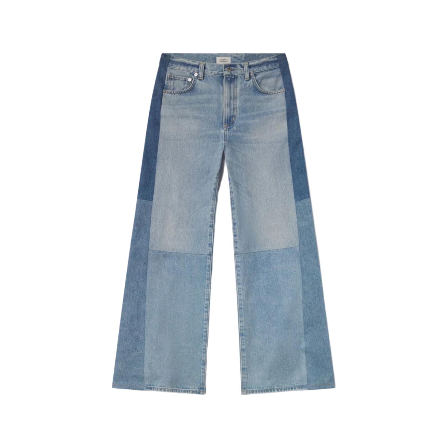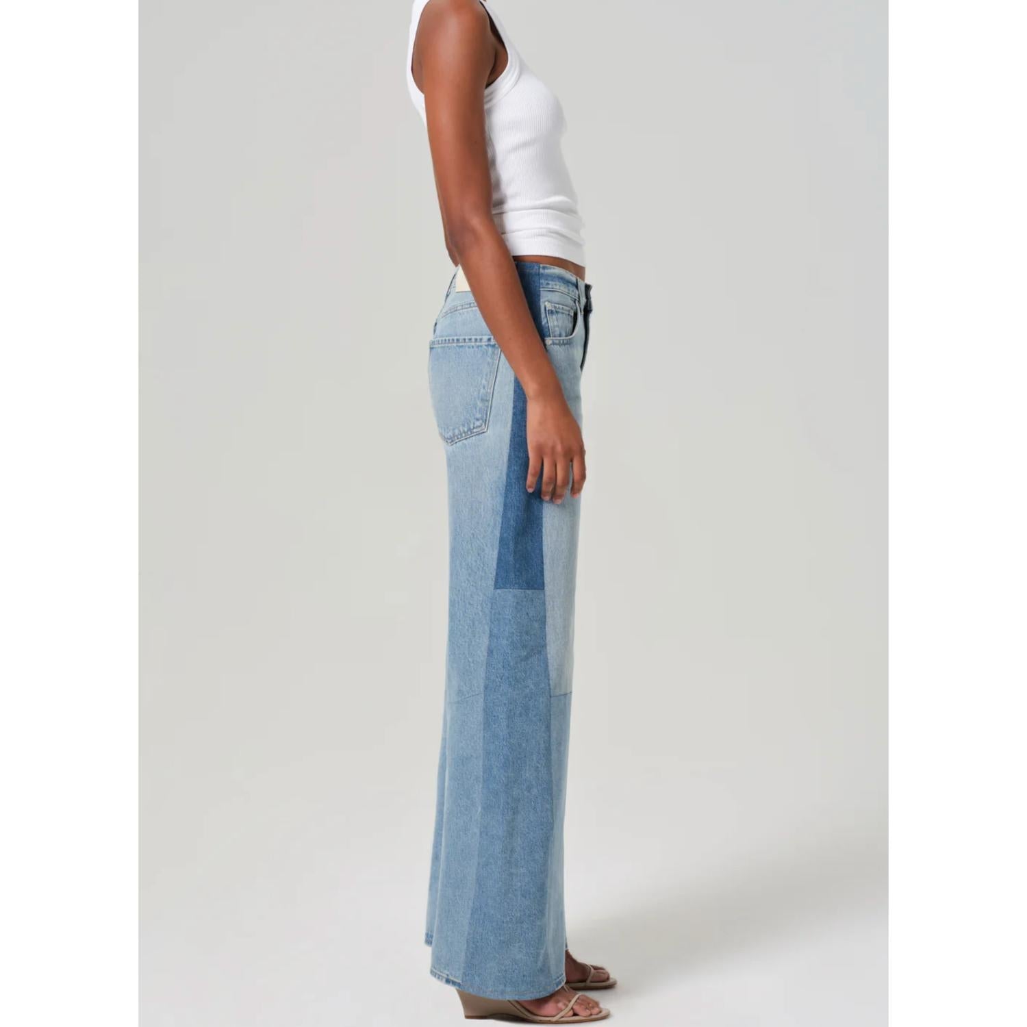 Showcasing a vintage-inspired wide leg and a medium wash in the color Intrigue. Crafted from 100% regenerative cotton, these jeans offer a comfortable fit with an 11.75" rise, 32" inseam, and a generous 24" leg opening. With a zip closure and pockets, they are both practical and stylish. Made in the USA with imported materials, these jeans are easy to care for: machine wash cold inside out and tumble dry low. Model is 5'10" and wears size 27.
