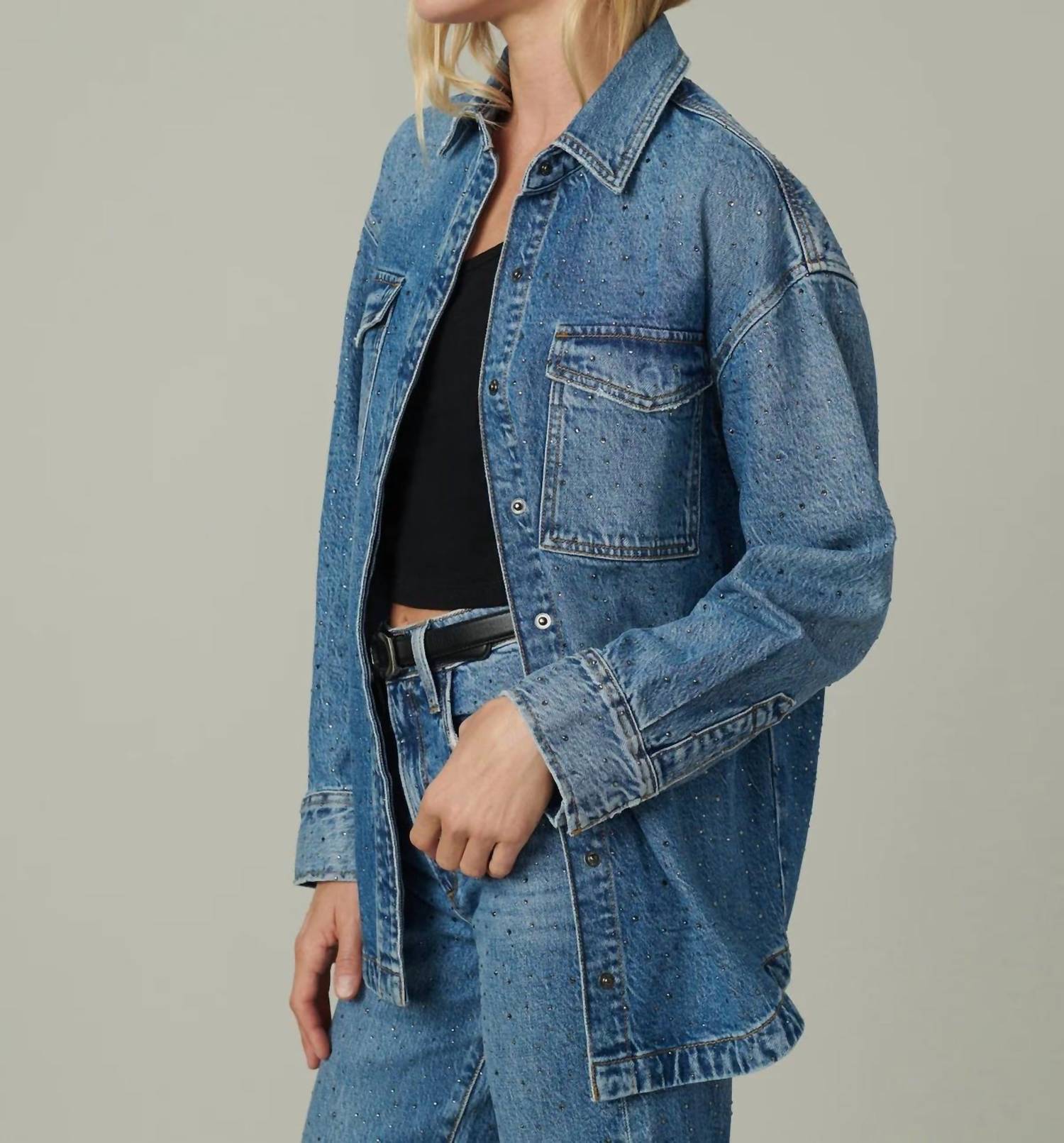 The Katrina Crystal Shirt Jacket by Joe's Jeans in the Stargaze color exudes an elegant yet relaxed vibe. This long-sleeve jacket is made from 99.5% cotton and 0.5% spandex, showcasing an oversized silhouette with a drop shoulder design. It features a hidden snap closure and functional chest flap pockets, accentuated by smoky grey rhinestones for added charm. A medium-indigo, vintage-inspired wash enhances its aesthetic appeal.