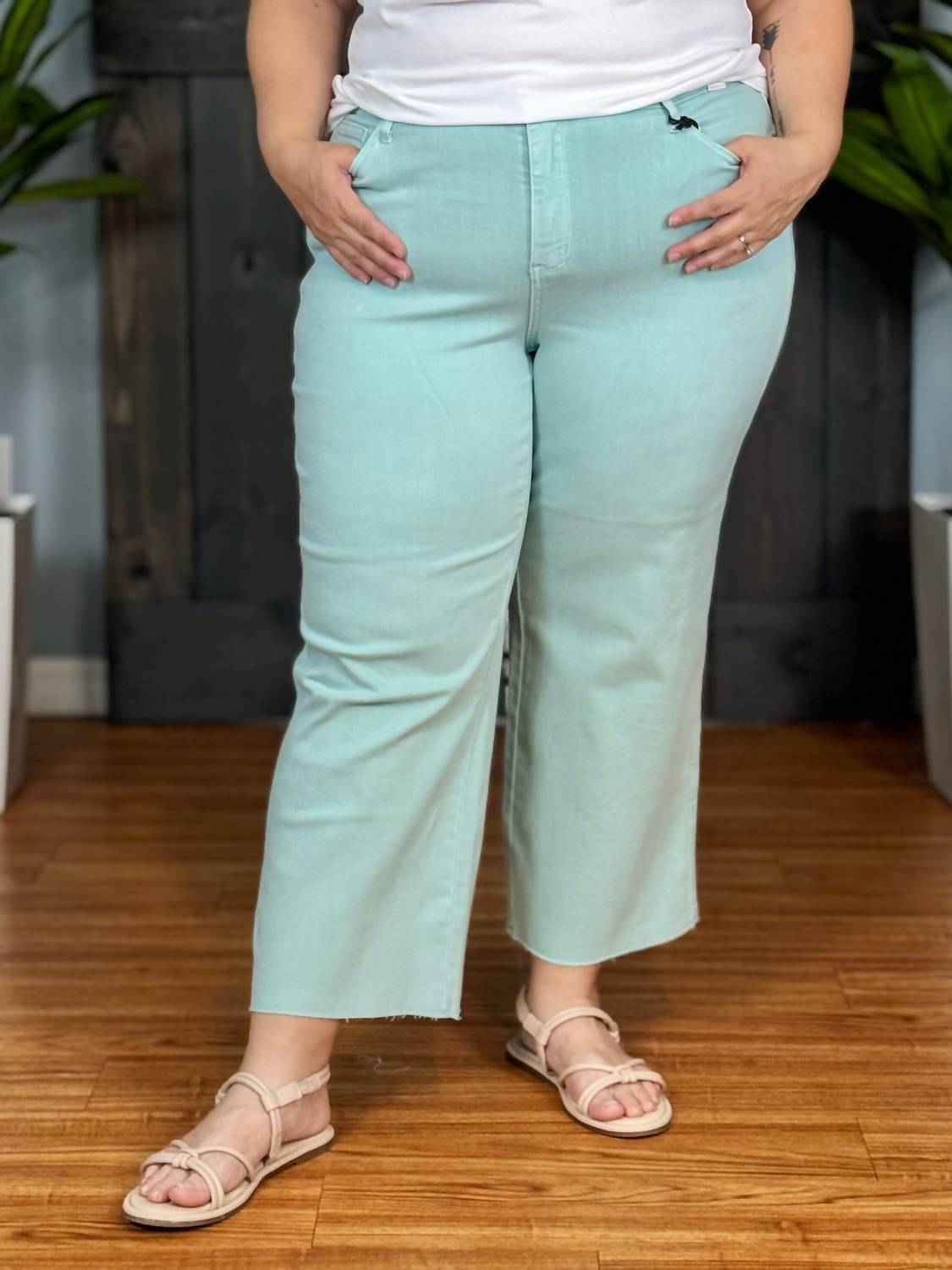 We especially love this cropped jean with a cute pair of slides or sandals. Elevate your spring wardrobe with the High Waist Crop Wide Leg Jeans by Judy Blue in a vibrant light blue sky hue. Crafted from a comfortable blend of 93% cotton, 6% polyester, and 1% spandex, these jeans feature a high-waisted fit with a relaxed, wide-leg style and a raw hem. Measuring a front rise of 10.75" and an inseam of 24.5", they offer a distinctive flair while ensuring comfort. Closure: Button closure. Care: Machine wash, tumble dry. Perfect for a standout look, these jeans effortlessly transition from a preppy brunch to a stylish baby shower occasion.