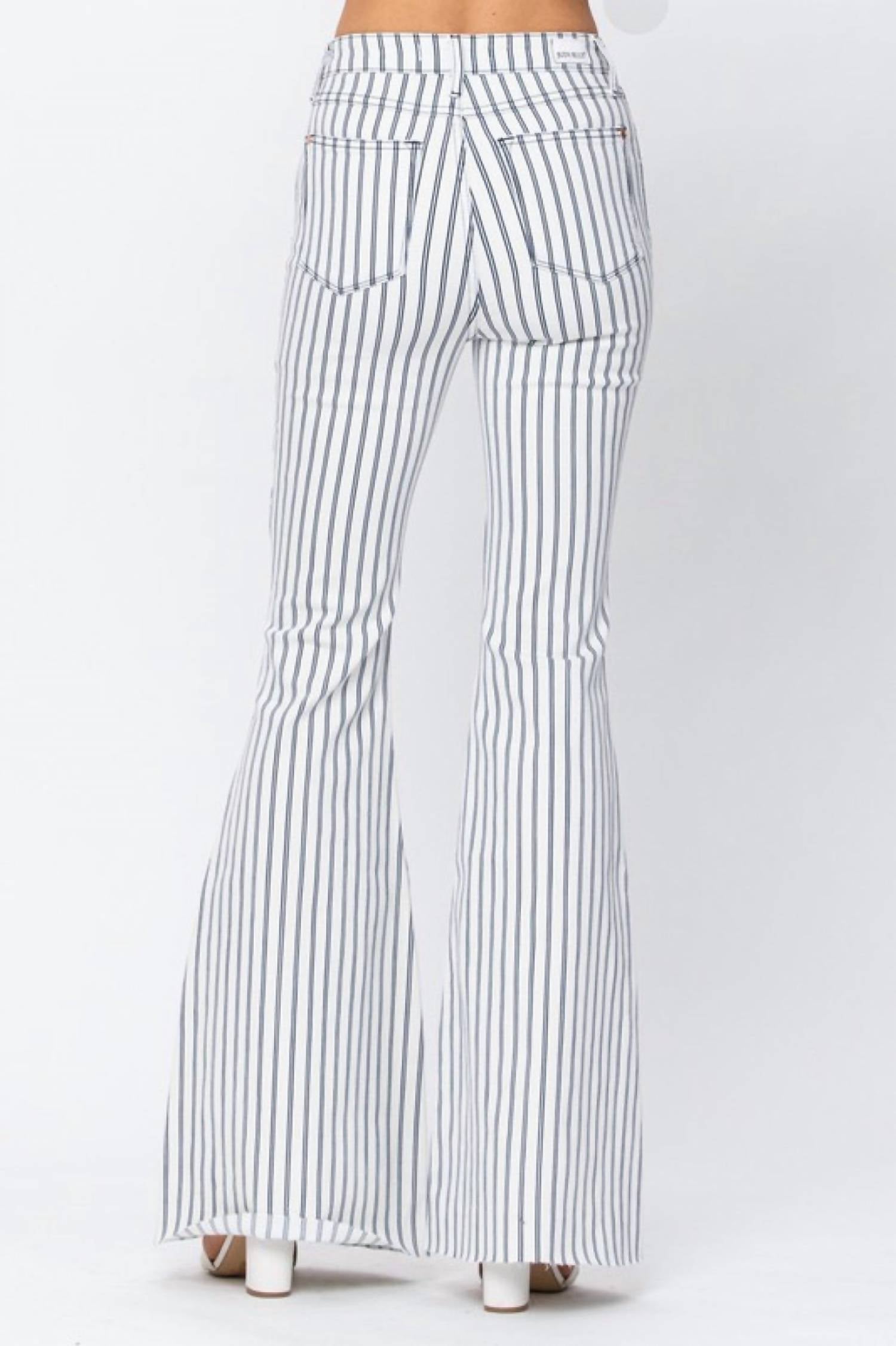 Step out in sophisticated style with Judy Blue's High Waist Super Flare Pin Stripe Jeans, tailored for those who love a touch of preppy charm. Complemented by a striking striped pattern, these flared pants feature a high waist with both button and zip closures for a secure fit. Expertly crafted from a cotton blend, these jeans offer slight stretch for comfort in regular and plus sizes, featuring practical pockets for added utility. Composition: 64.7% Cotton, 21% Rayon, 12.9% Polyester, 1.4% Lycra. Care: Machine wash or professional dry clean, tumble dry. The jeans boast a rise of 11 inches and a flattering inseam of 35.5 inches.
