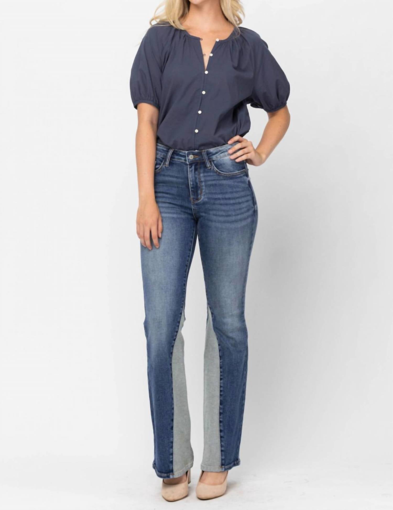 Embrace effortless style with the Women's Inseam Panel Flare Jeans by Judy Blue, featuring a medium wash in a trendy grey color. Expertly crafted from 94% Cotton, 5% Polyester, and 1% Spandex, these jeans offer a comfortable classic fit with a flared leg, perfect for summer streetwear and vacation vibes. The design includes a zip closure and functional pockets, ensuring practicality meets fashion. With a rise of 10" and an inseam of 33.5", these jeans are modelled by someone 5'10" with a waist and hip size of 24.5" and 38" respectively.