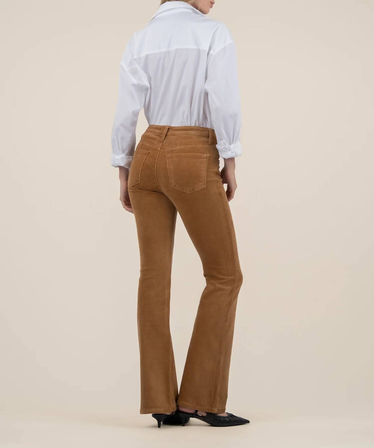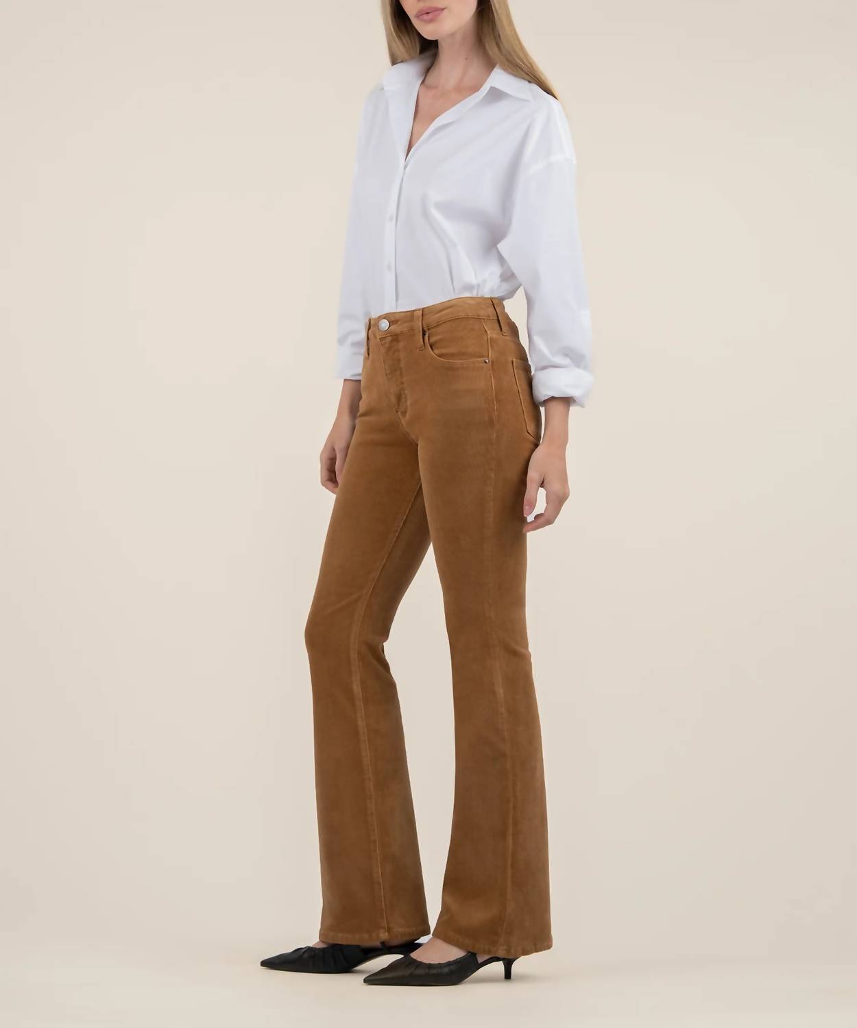Introducing the Ana Corduroy Jeans by KUT FROM THE KLOTH, a perfect addition to your fall wardrobe in a sophisticated camel hue. Crafted from a cotton blend, these solid, mid-rise jeans feature a flared leg and floor-grazing length with Fab Ab front pockets for a smoothing effect. The pants offer a 33" inseam, 20 1/2" leg opening, and 10 1/4" rise, providing a relaxed, flattering fit. Made with a convenient zip closure, they are easy to care for—machine wash and tumble dry.