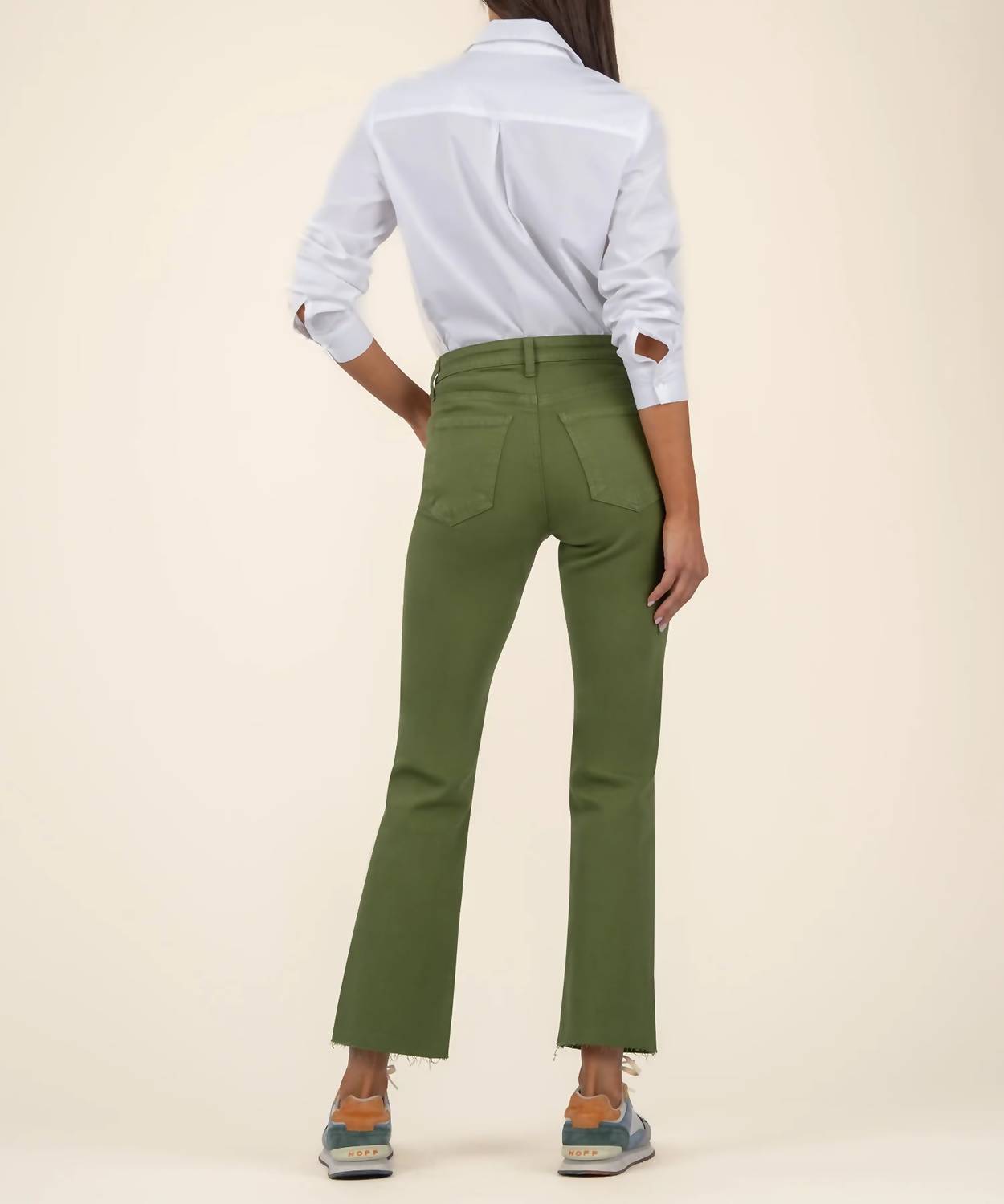 Just as cute as they are comfortable. Elevate your wardrobe with the Kelsey High Rise Ankle Flare Jeans by KUT FROM THE KLOTH, featuring a flattering high-rise design and trendy flare silhouette. Crafted from a comfortable cotton blend of 98% Cotton and 2% Spandex, these jeans come in a sleek army green color, perfect for versatile styling. The jeans have a button closure, raw edge hem, and include signature Fab Ab pockets to enhance your shape. With a 27 3/4" inseam, 17 3/4" leg opening, and rise of 10 1/4", these jeans offer a modern fit that's ideal for spring streetwear and travel occasions. Care instructions include machine wash and tumble dry for easy maintenance. The model, standing at 5'9" with a 24" waist and 35" hips, is wearing a size 0.