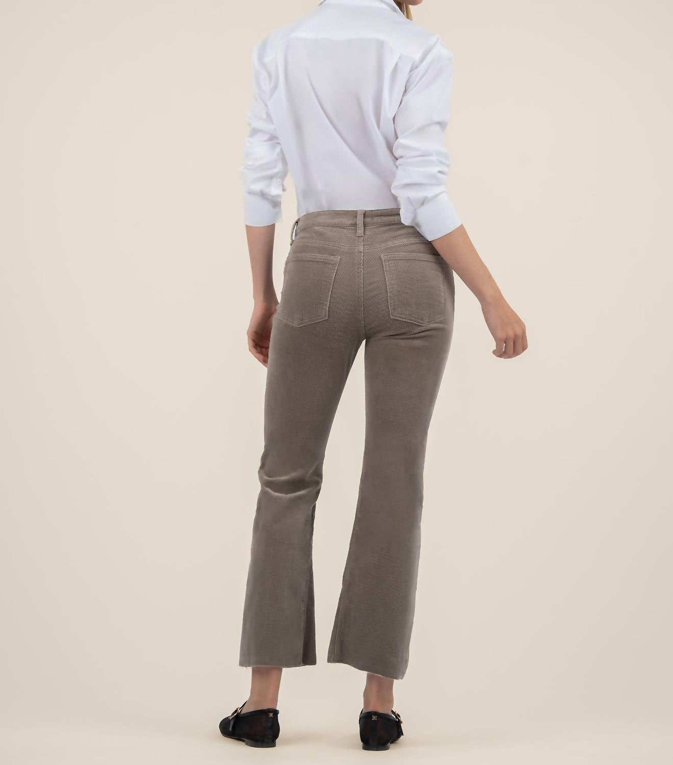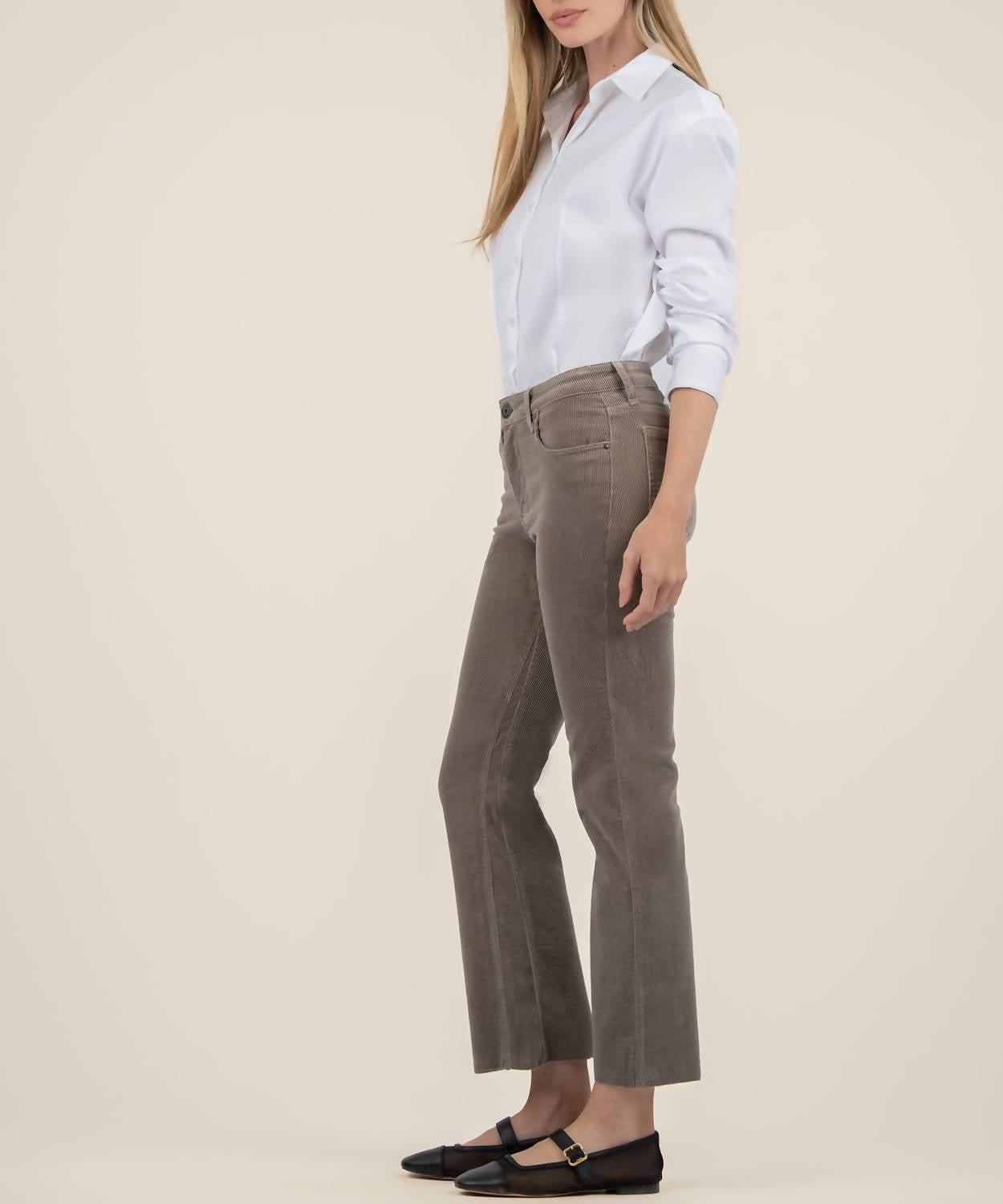 Crafted from a stretchy 98% cotton and 2% spandex blend, these rosemary corduroy pants feature a contemporary flared leg with a cropped silhouette. Designed with a mid-rise fit for all-day wearability, they boast an inseam of 27.5", a leg opening of 18", and a rise of 9.75". Button closure. Made in China. Maintain with machine wash cold instructions and can be tumble dried on low.