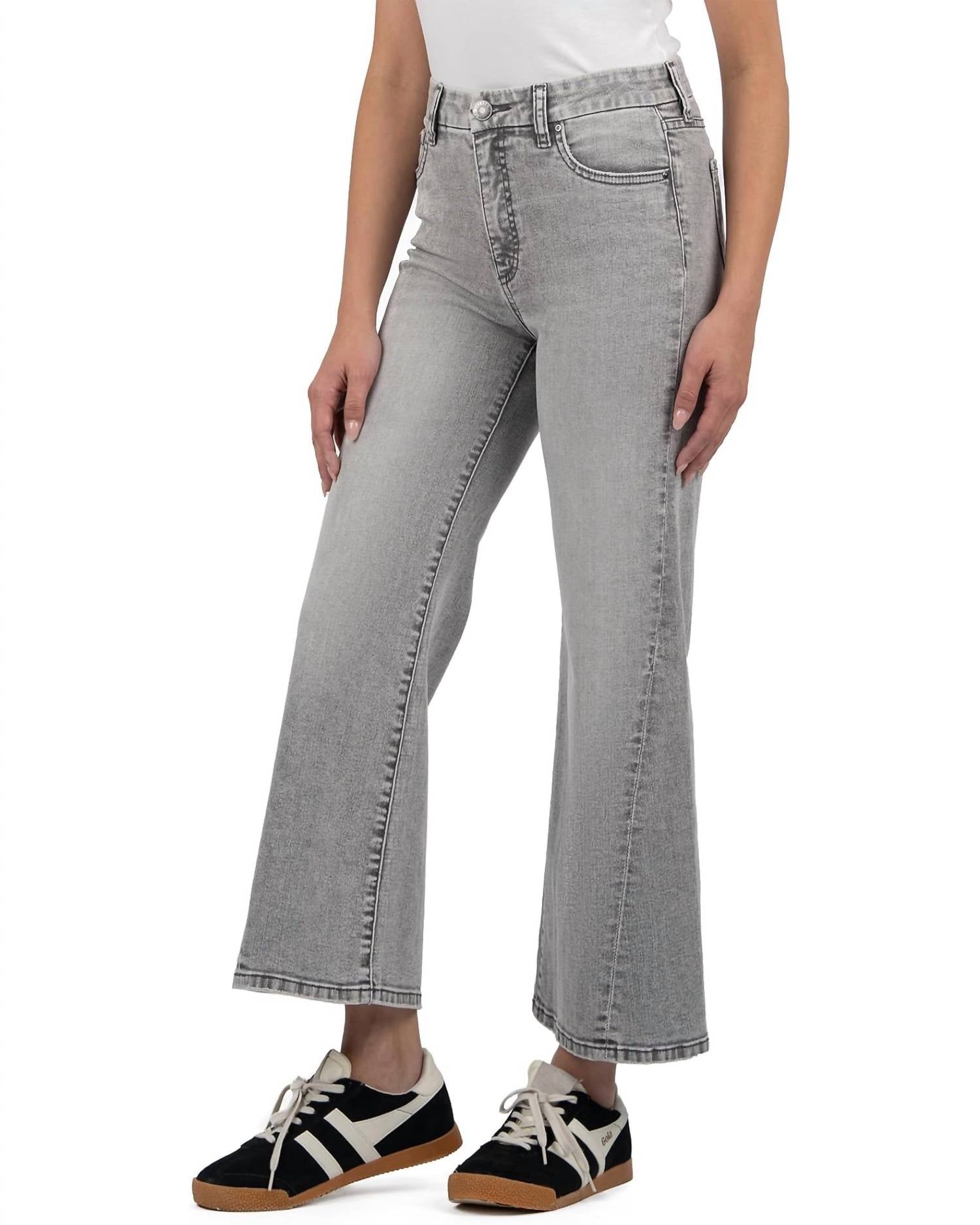 Crafted for a fashion-forward look with seam details and a relaxed, wide leg style. High-waist jeans are made from 91% Cotton, 7% Recycled Polyester, and 2% Elastane. Complemented by a button closure and fab ab front pockets for smoothing comfort. Color is Stride with a grey base wash. Feature a 10.5" rise, 27" inseam, and 23" leg opening. Machine wash cold with like colors and tumble dry low.