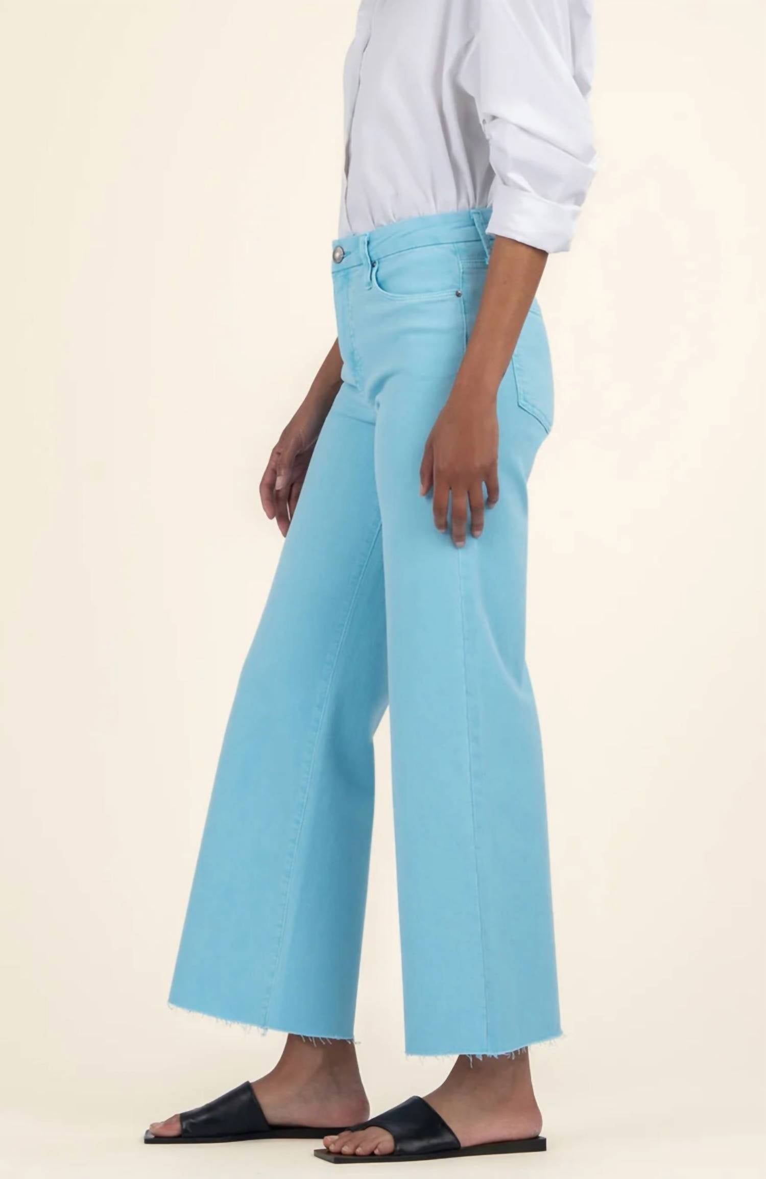 Discover the Meg High Rise Fab Ab Wide Leg Raw Jeans by KUT FROM THE KLOTH, a striking addition to your wardrobe in Capri Blue. These women's high rise pants boast a 98% Cotton and 2% Spandex composition, ensuring comfort with a flattering fit. Complete with a button closure and wide leg style, the pants feature a 10.5" rise and 27.25" inseam, embodying modern workwear trends. For easy maintenance, machine wash and tumble dry these stylish jeans, designed to add a vibrant edge to any ensemble.