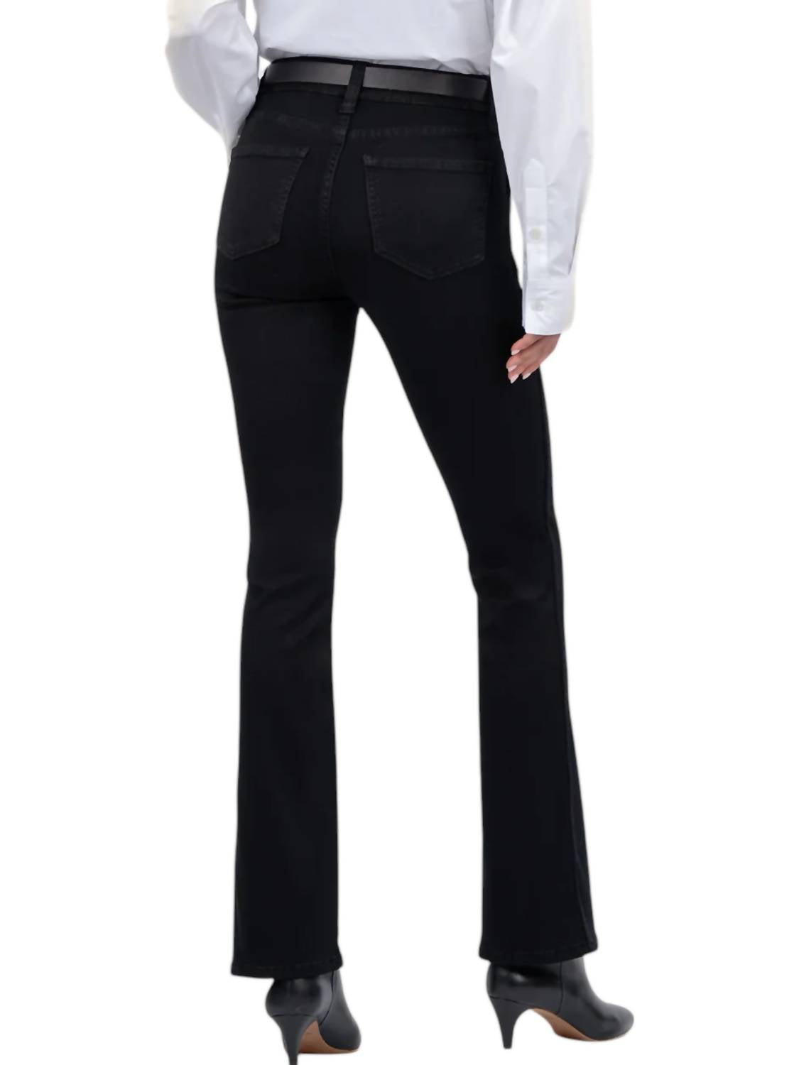 Designed to elongate your legs with their stylish bootcut leg. Sleek black jeans. Crafted from a comfortable blend of 43% Rayon, 30% Cotton, 25% Polyester, and 2% Spandex. Featuring a flattering high rise with a 10 1/4" front, a 33" inseam, and an 18 1/4" leg opening. Closure is convenient with a button. Machine wash cold inside out and a low tumble dry.
