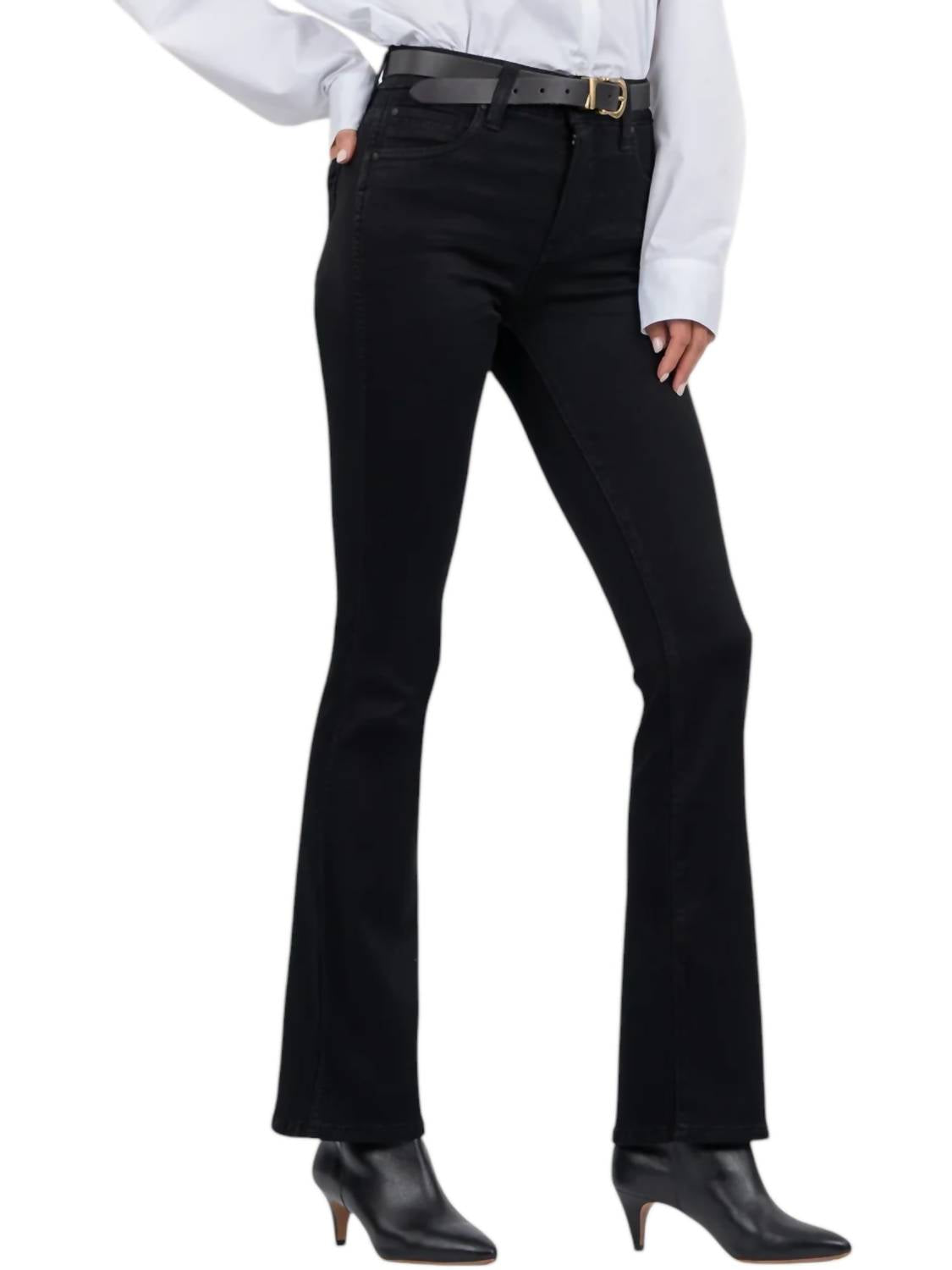 If you're looking for boot-cut, this is the jean for you. Designed to elongate your legs with their stylish bootcut leg. Sleek black jeans. Crafted from a comfortable blend of 43% Rayon, 30% Cotton, 25% Polyester, and 2% Spandex. Featuring a flattering high rise with a 10 1/4" front, a 33" inseam, and an 18 1/4" leg opening. Closure is convenient with a button. Machine wash cold inside out and a low tumble dry.