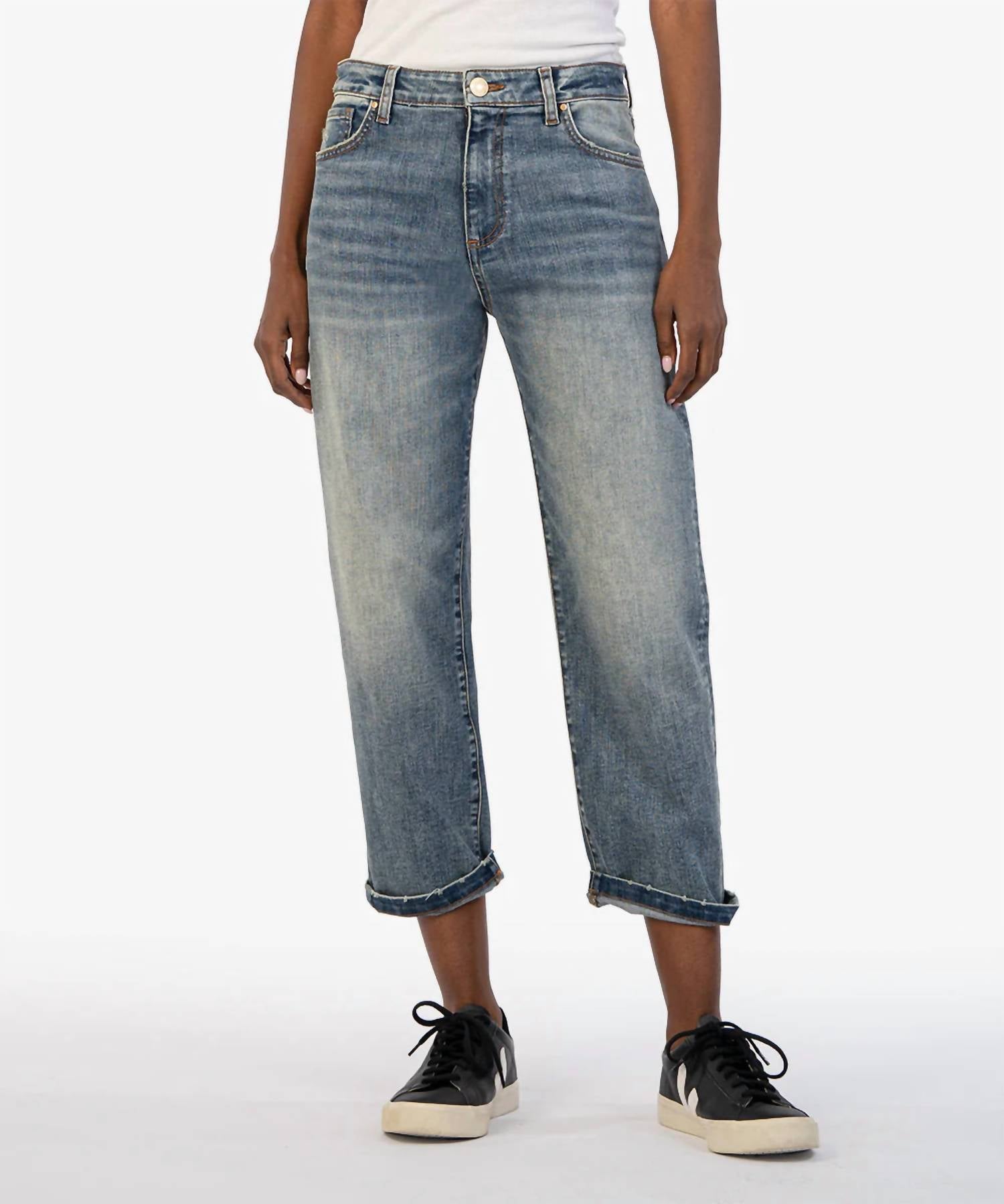 a laid-back feel while still surprisingly form-flattering. Experience laid-back style and comfort. Made from a stretch denim blend of 74% Cotton, 24% Polyester, and 2% Lycra. Showcase a stylish faded and whiskered look in Shaped Wash. Feature a high-rise waist with a 25.5" inseam after roll-up, an 11" rise, and a 14.5" leg opening. Designed for a true-to-size fit. Come with button closure. Machine wash and tumble dry low instructions.