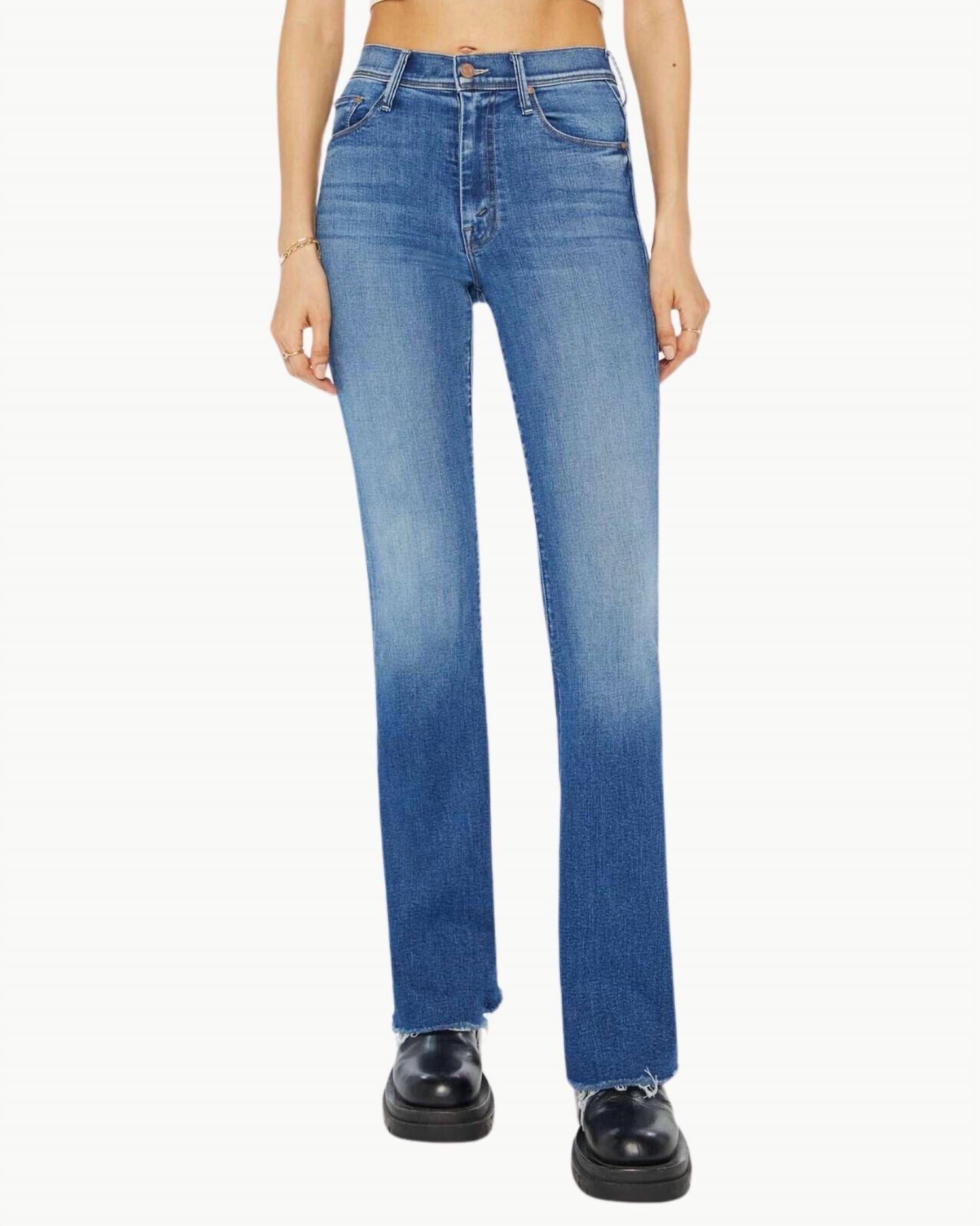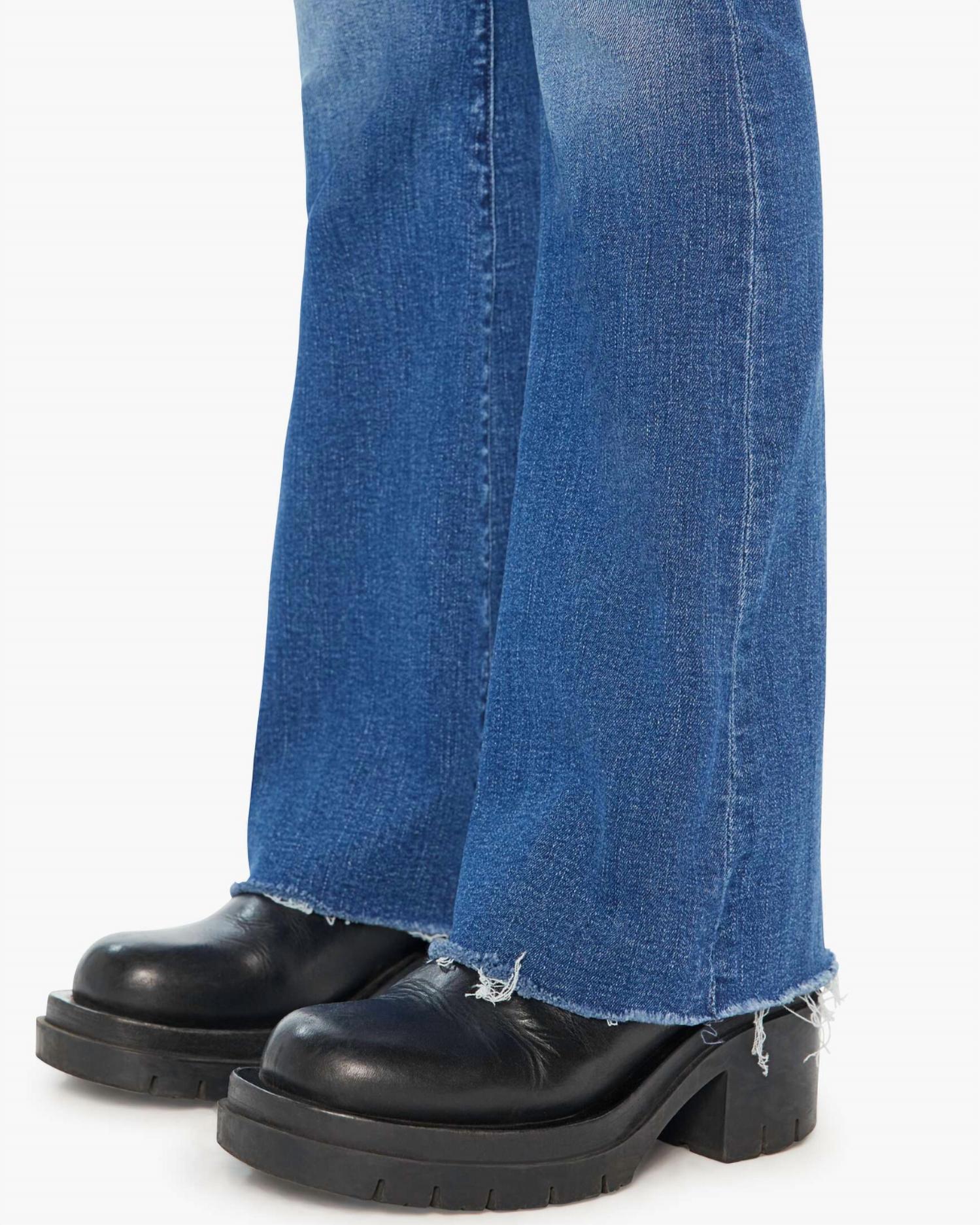 Introducing the Cruiser Mid-rise Flared Leg Jeans by Mother, crafted for the perfect blend of style and comfort. These women's jeans feature a flared leg style with a long 32-inch inseam and a relaxed fit, complemented by a mid-rise 9 3/4-inch waist. Made from a sustainable blend of 49% Cotton, 21% Pre Consumer Recycled Cotton, 11% Lyocell, and 17% Post Cons Recycled Polyester, they come in a medium wash with whiskering and fading at the knee. Closure: Button closure. Care: Machine wash and tumble dry.
