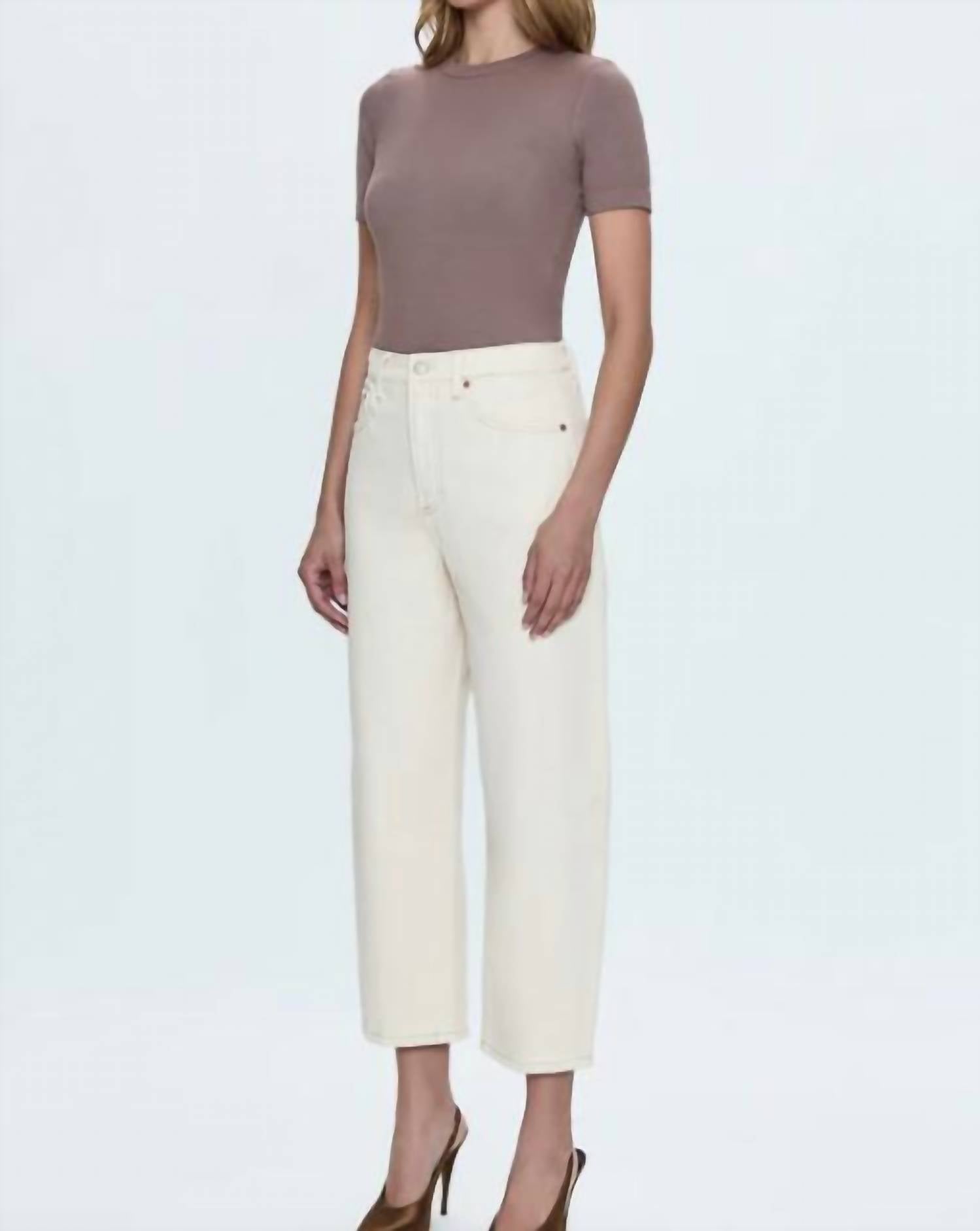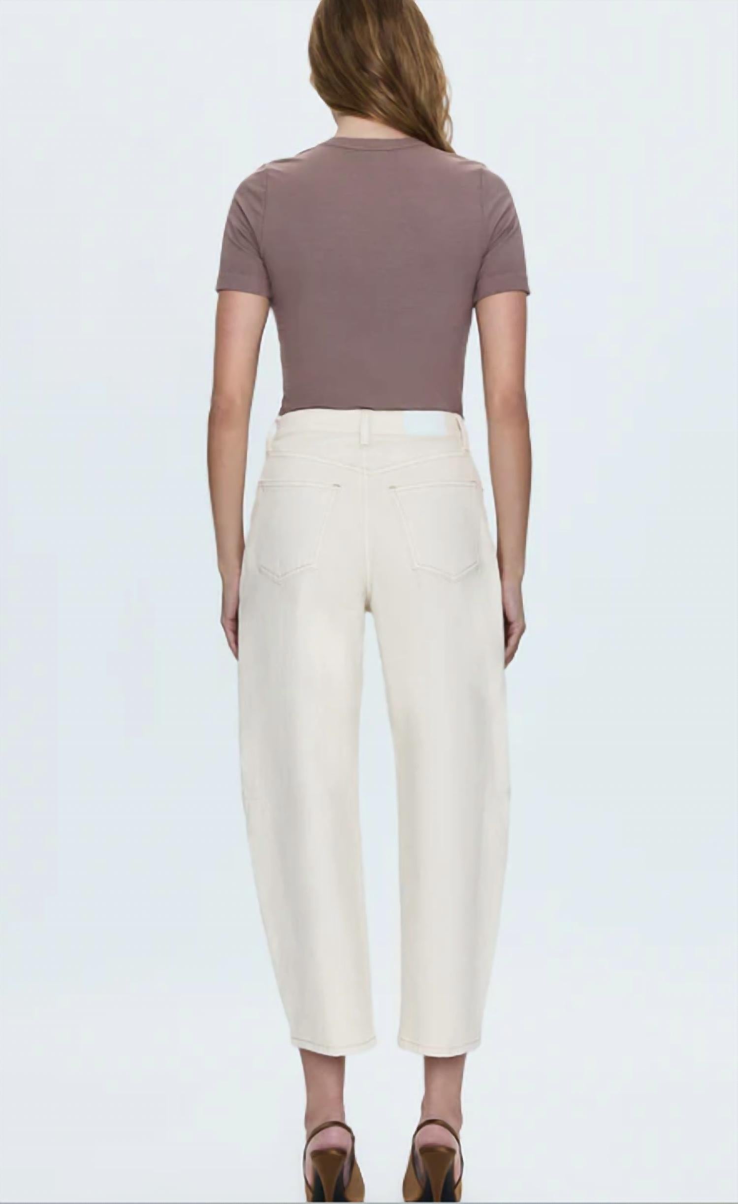 High-waist is here to stay and we especially love this style. A modern silhouette designed with a barrel bowed leg and a relaxed silhouette with a 26" inseam. Crafted from our wear-everywhere comfort stretch denim. Offered in a warm, off-white colored denim wash with contrast stitching and contrast metallic hardware.