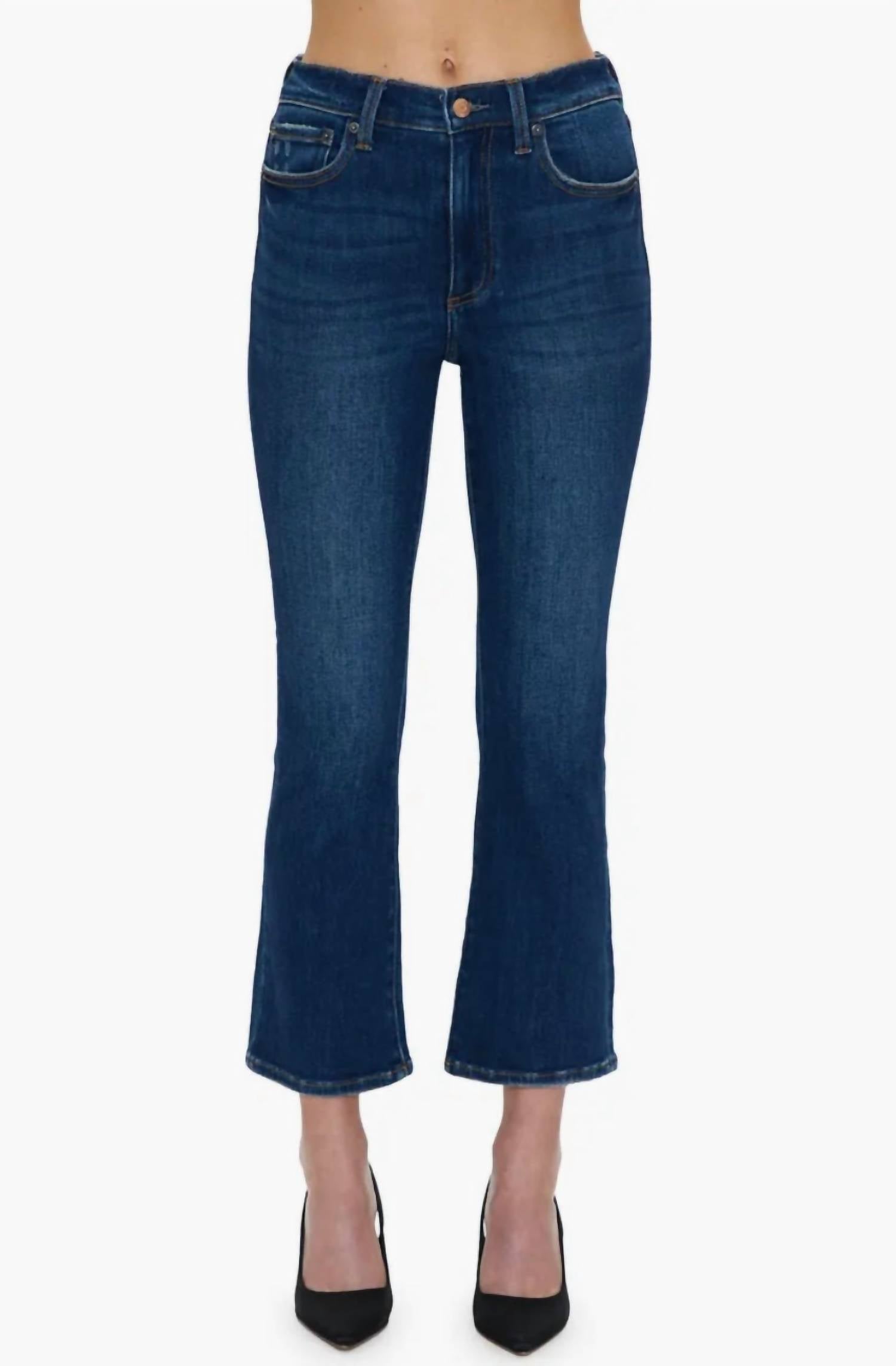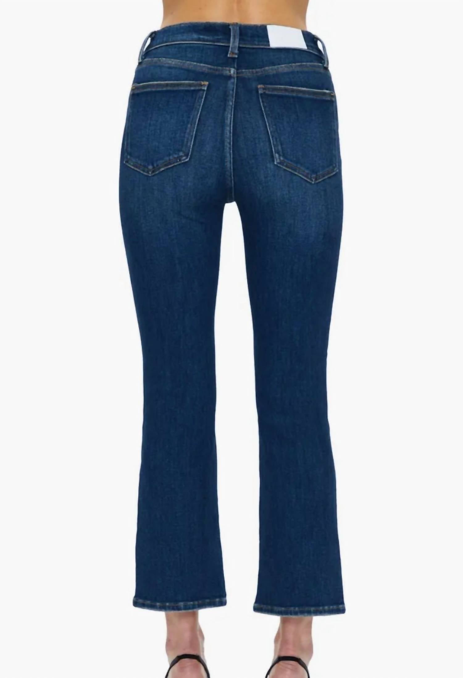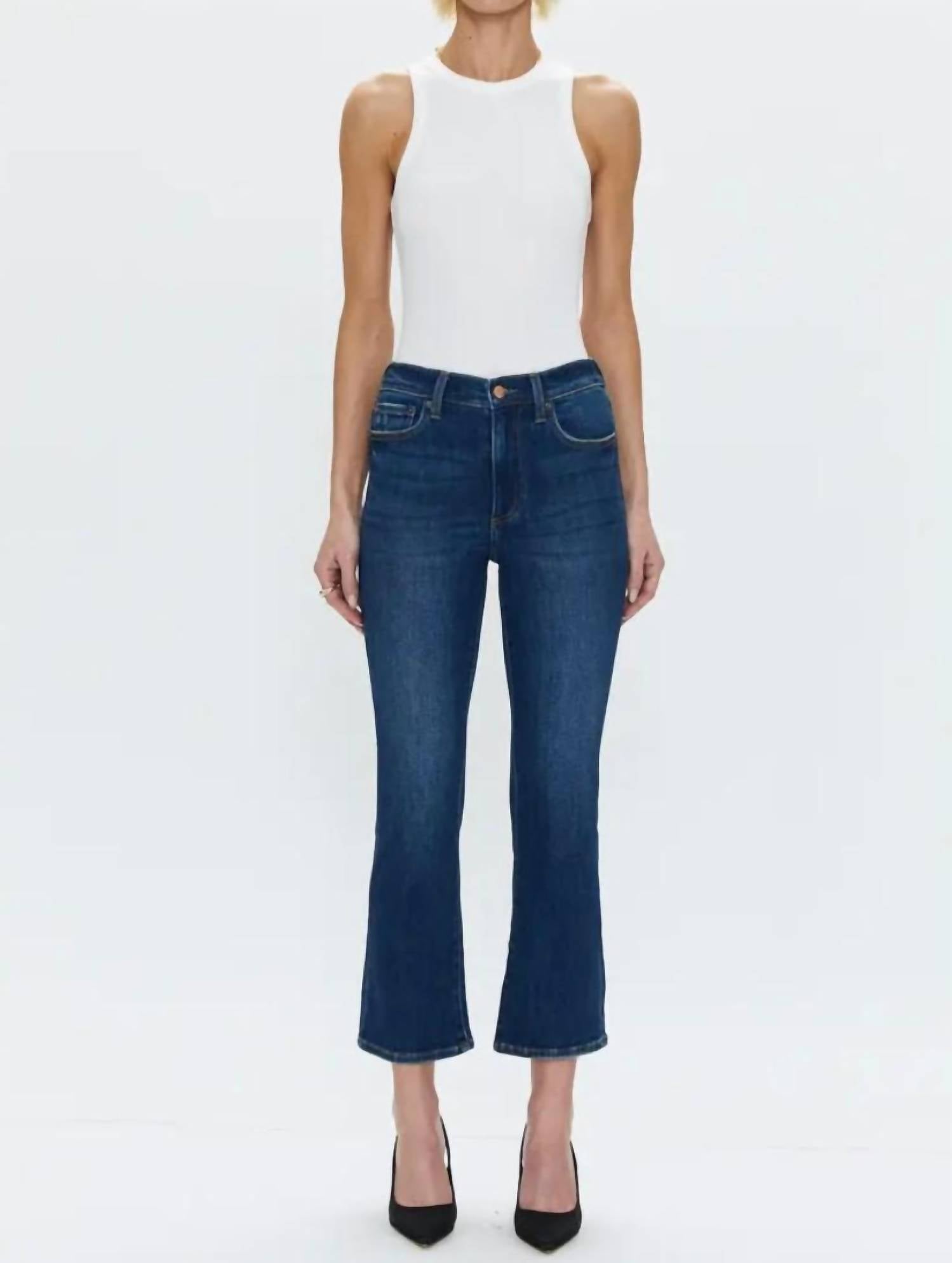 If you're looking for boot-cut, this is the jean for you. Elevate your denim game with the PISTOLA Lennon High Rise Crop Boot Jeans in the sophisticated Rosslyn dark wash. These jeans feature a high waist, bootcut leg, and cropped hem, perfectly balancing a vintage-meets-modern aesthetic ideal for showcasing your favorite footwear. Composition: 95% Cotton, 4% Elasterell, 1% Spandex. Closure: Copper button closure. Care: Machine wash and tumble dry. With a rise of 11", inseam of 27", and a 16 1/2" leg opening, these jeans are crafted for a flattering, relaxed fit that's perfect for any spring occasion.