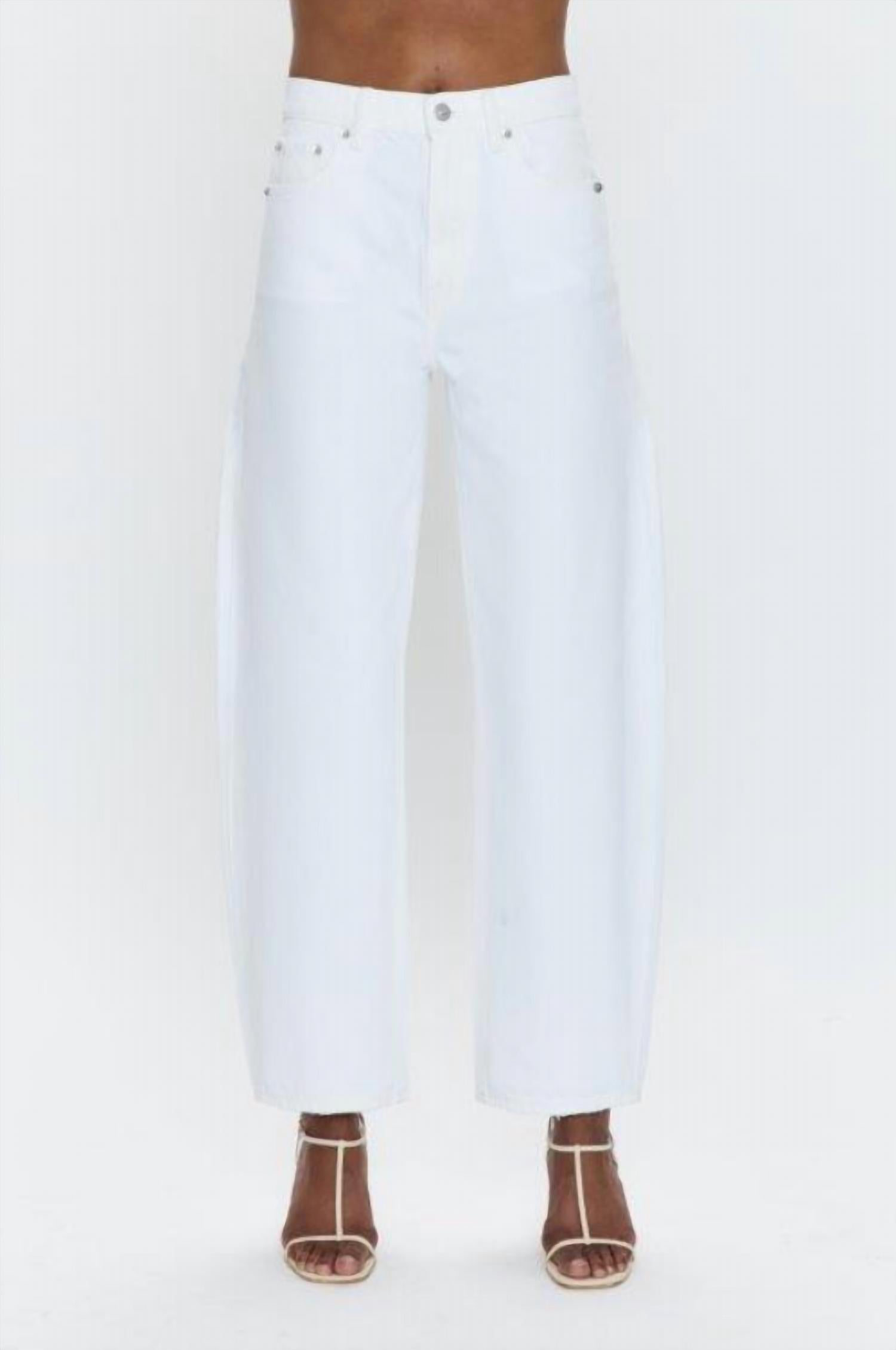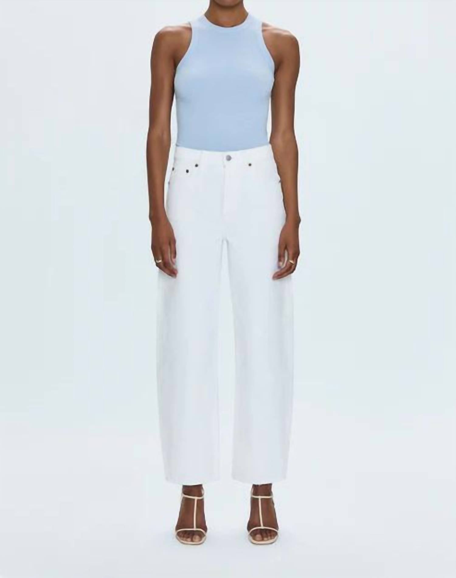 Pair these wide leg jeans with mules, slides or your favorite strappy sandals. Meet the Wes Barrel Jeans by PISTOLA, a striking addition to your wardrobe in Vivid White. Crafted in solid denim fabric with a relaxed fit, these high-rise jeans offer a flattering cylindrical leg design that measures 53 cm at the knee, tapering to 41 cm at the leg opening. The jeans feature a convenient zipper and button closure along with a 5-pocket design. Care is simple with machine wash instructions, making them perfect for a day at a summer music festival or a casual holiday look.