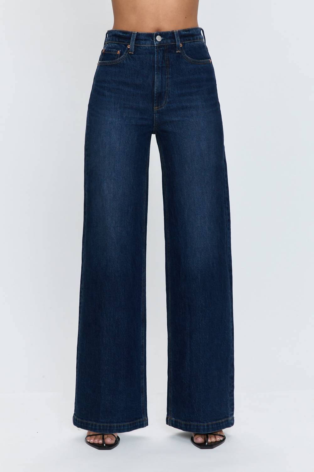 Meet the Women's Lana Wide Leg Jeans by PISTOLA, showcasing a relaxed fit with an ultra-wide leg silhouette and a high-rise waist. This style, available in the Elevation color, offers a full-length cut with a clean finish hem, crafted from their signature comfort stretch denim composed of 77% Cotton, 22% Tencel, and 1% Spandex. These jeans feature a 12" rise and a 33" inseam, complemented by a 24" leg opening, and come equipped with practical pockets and a secure zip closure. Proudly imported, these jeans demand ease with machine wash and tumble dry care instructions, perfect for a spring concert or an addition to your workwear collection. Model is 5'9" wearing size 26.