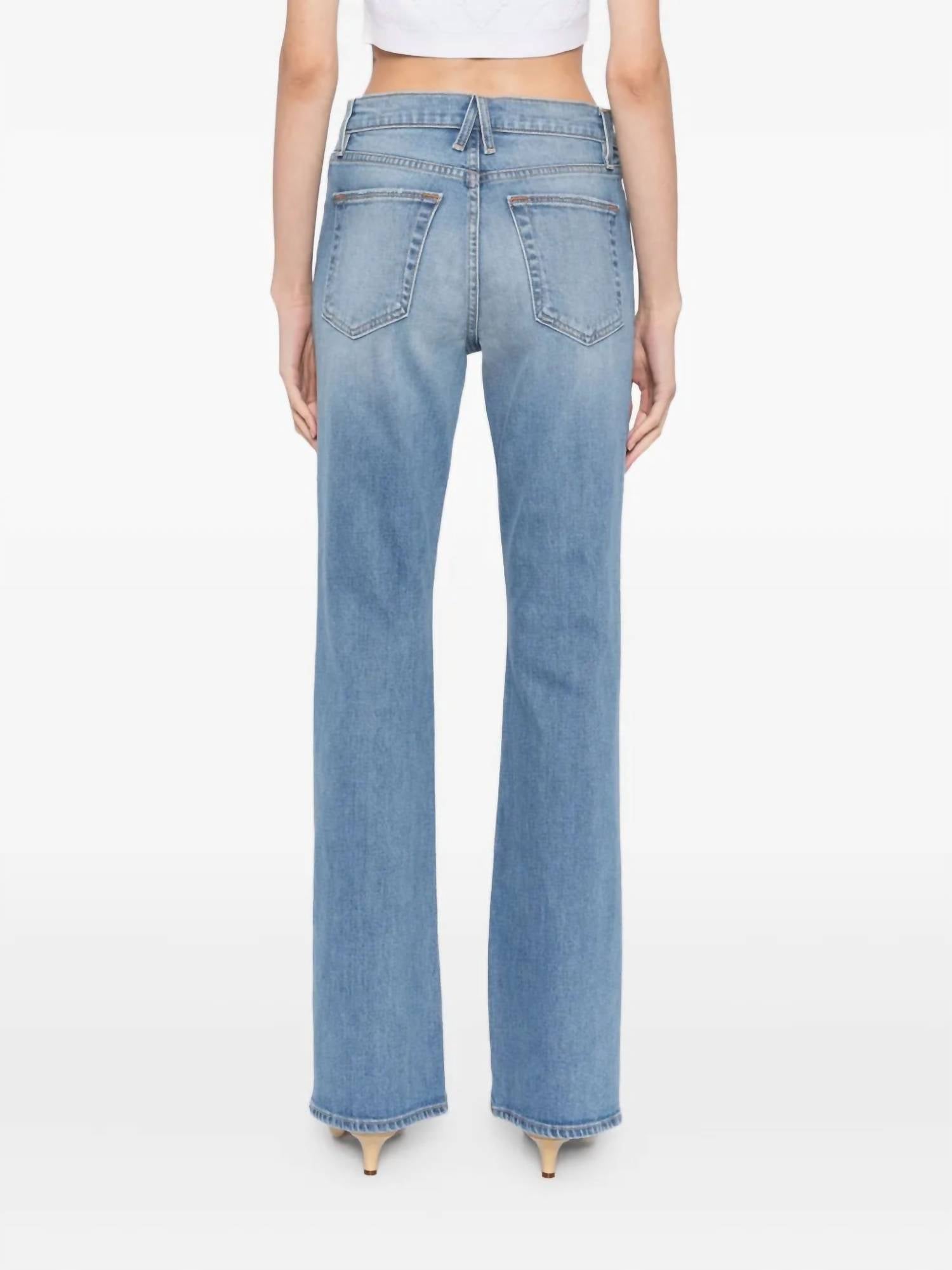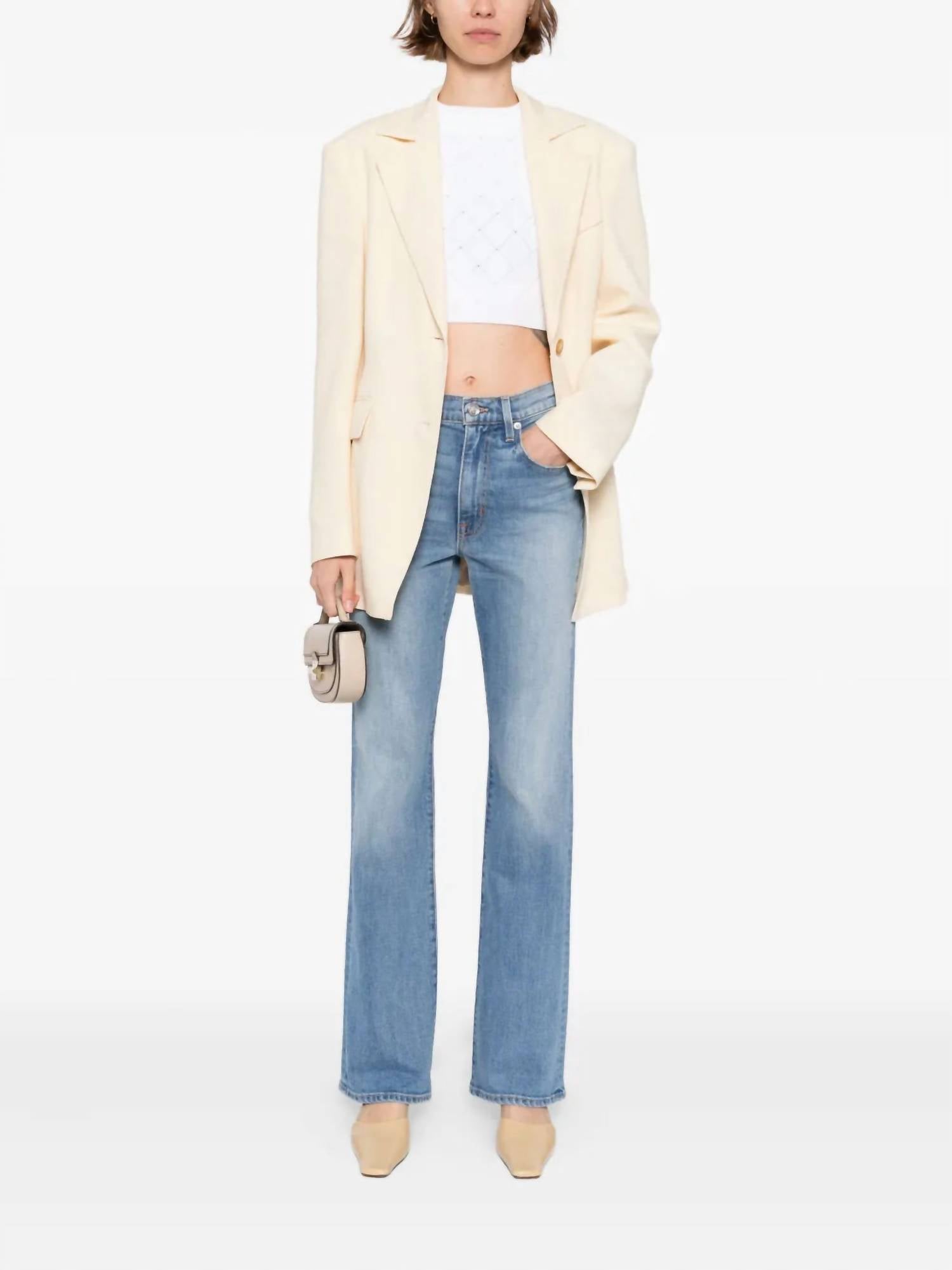 A boot-cut jean that not only looks good on, you'll be comfortable in them all day. Introducing the Anita Jeans by SLVRLAKE, a chic update on the classic bootcut in a unique 'Right On Time' shade. Crafted with a high-rise waist and a flattering bootcut silhouette, these jeans offer a form-fitting design from waist to thigh. Composition: 98% Cotton, 2% Elastane, with a brushed antique button closure, made in the USA with fabric originating from Italy. Care: Machine wash cold on a delicate spin with similar colors, and lay flat or hang dry away from direct heat or sunlight. Perfectly suited for fall streetwear and travel occasions.
