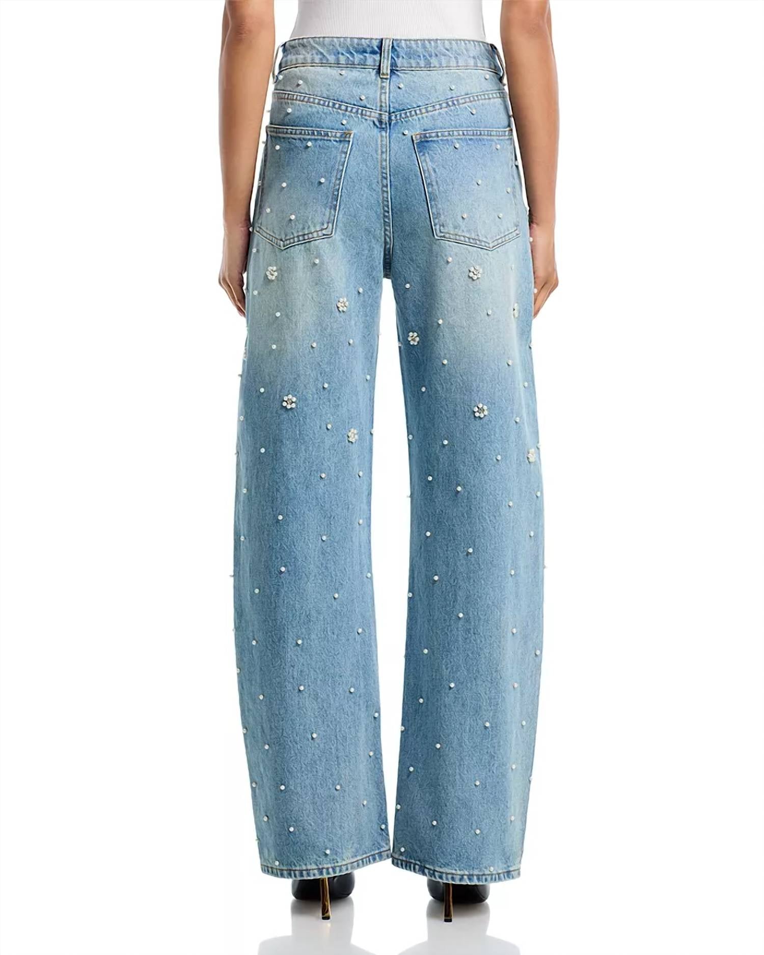 Just as cute as they are comfortable. Introducing the Fianna Embellished High Rise Barrel Jean by Steve Madden in a Coastal Blue color, perfect for making a statement. Crafted from cotton, these jeans feature a high-rise design with a 12" rise and a stylish barrel-leg silhouette, showcasing a long 31.5" inseam and a 20.5" leg opening. The jeans have a unique light wash with faux-pearl and rhinestone embellishments, silver-tone hardware, and belt loops, equipped with a zip fly and button closure for a secure fit. Care should be taken by hand washing these jeans to preserve their intricate detailing. Model is 5'10" with measurements of 33" bust, 25" waist, and 35" hips, wearing a size 27.