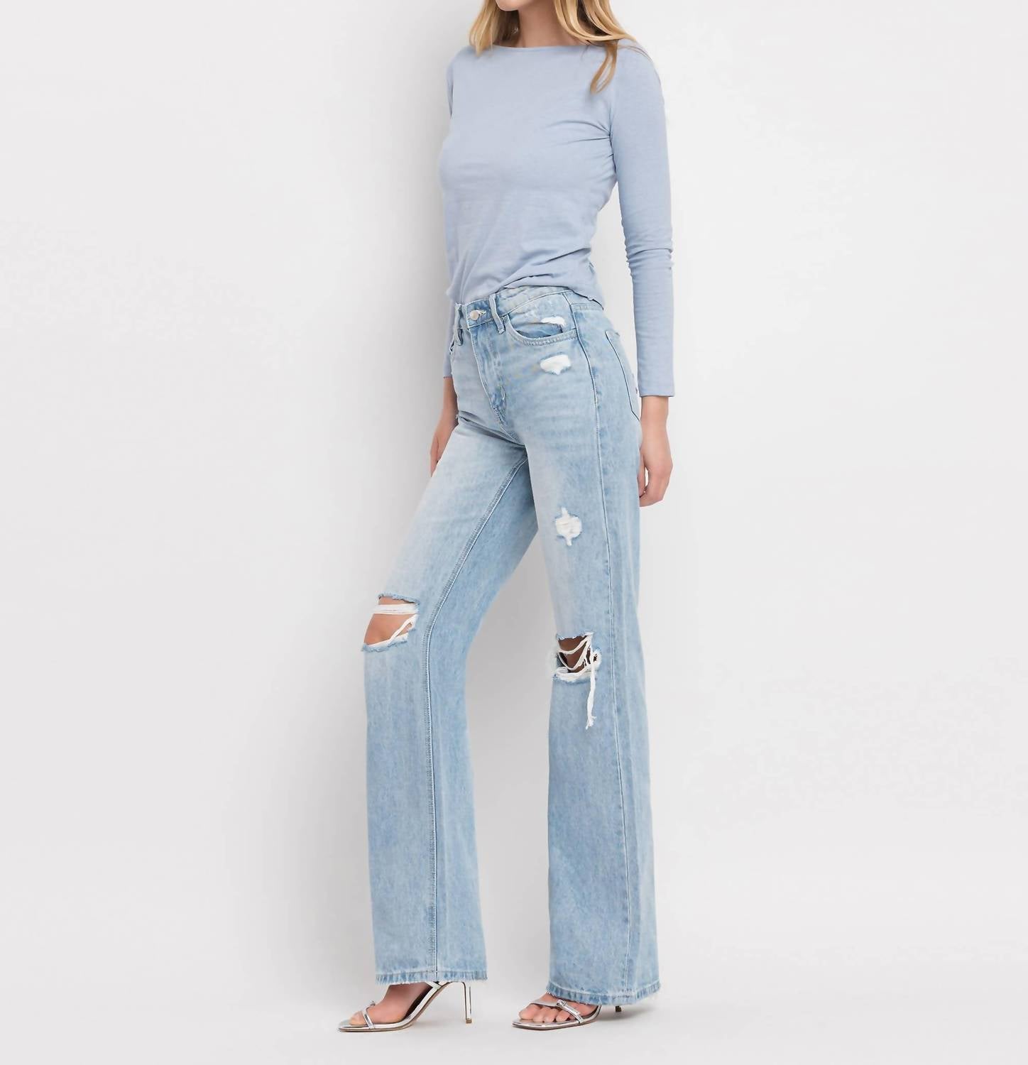 High-waist is here to stay and we especially love this style. Introducing the 90's Vintage Denim Jeans by Vervet by Flying Monkey, designed in the refreshing Sunny Plains hue for a modern throwback look. These jeans feature a super high rise waist, full-length flare leg, and distressed detail that channels authentic 90's vintage style. Made from 100% cotton, they offer a relaxed fit with no stretch and practical button closure. Dimensions include a rise of 11.25", inseam of 34", and leg opening of 20". Care instructions recommend machine washing cold and tumble drying on low.