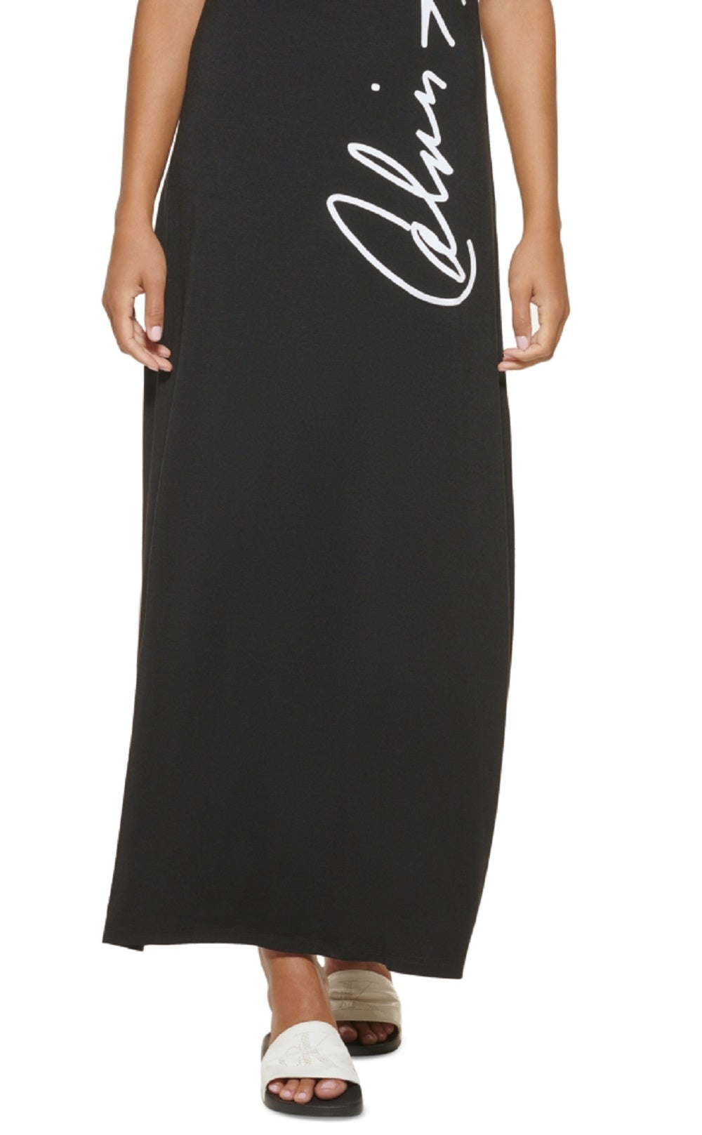 Rock a breezy silhouette with this casual and chic maxi dress from Calvin Klein. | Approx. 53-½ long from center back to hem| Scoop neck; maxi silhouette | Pull-on style | Sleeveless | Script logo down front | Unlined