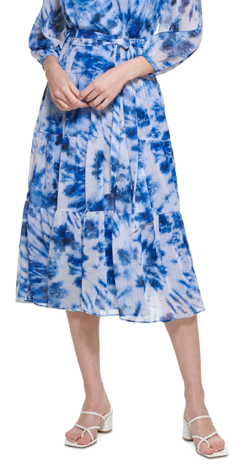 Update your sunny wardrobe with this chic dress from Calvin Klein| a breezy fit and flare silhouette defined by a self-tie sash and decorated with an eye-catching metallic tie dye design|