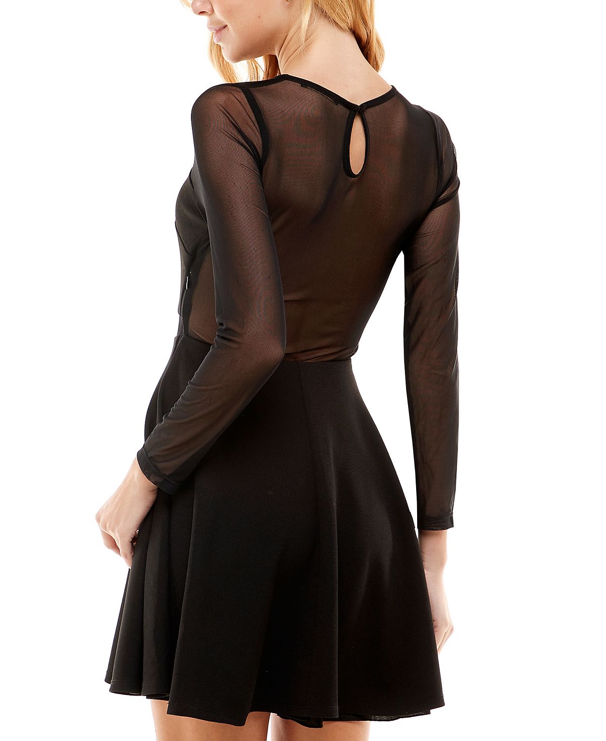 A fresh slant on fit & flare style| this City Studios asymmetrical dress infuses sheer illusion in all the right places. It's perfect for all the special occasions and celebrations on your calendar.| Illusion yoke| waist inset| sleeves and back panel| Lined| Fitted through the chest and waist; flared and flowing skirt
