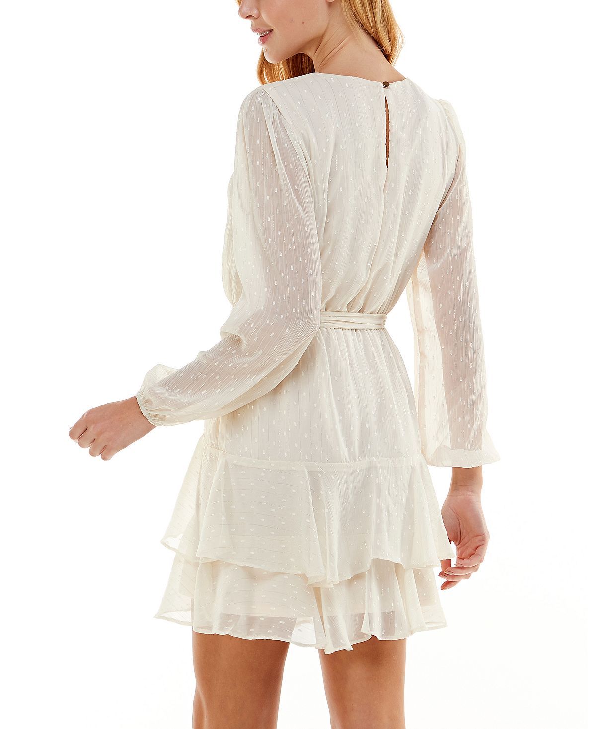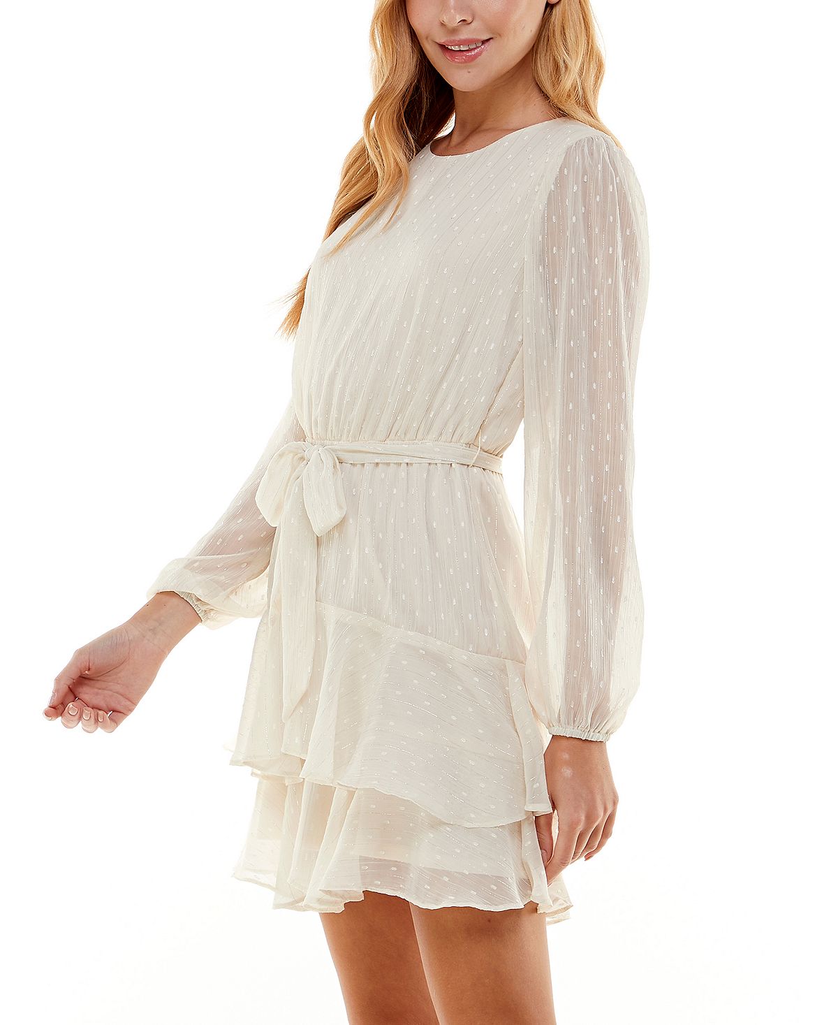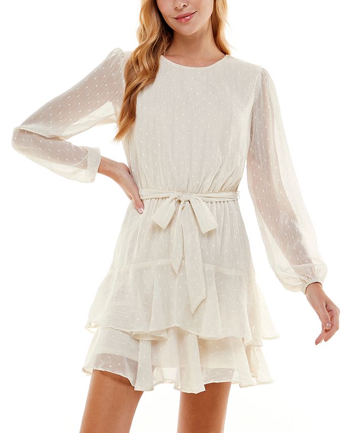 It's all in the details. City Studios levels up your favorite fit & flare silhouette with this fun look| a sheer-sleeved style with a bouncy skirt and waist-cinching tie.| Approx. 34 long from center back neck to hem. Length varies 1/2 between sizes| Runs small; if between sizes| order one size up| Fitted through the chest and waist; flared and flowing skirt