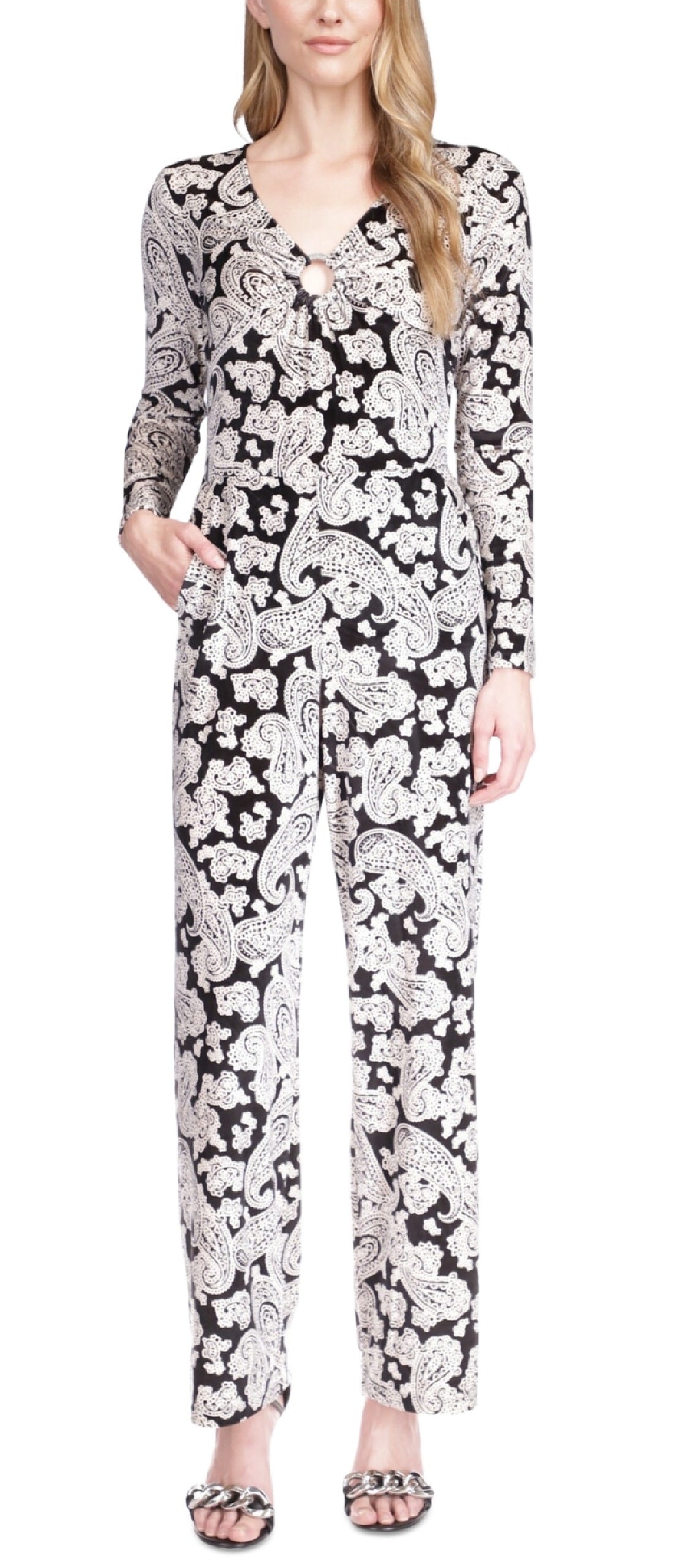 As effortless as it gets| this Michael Kors velvet jumpsuit highlights a bold paisley print with a ring at the neckline