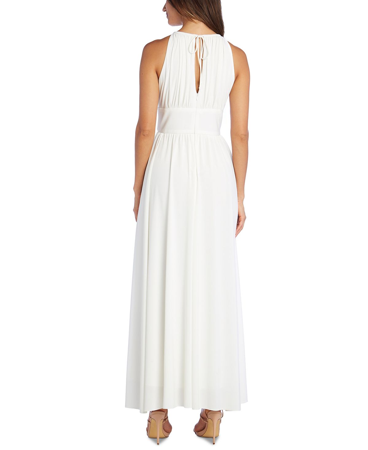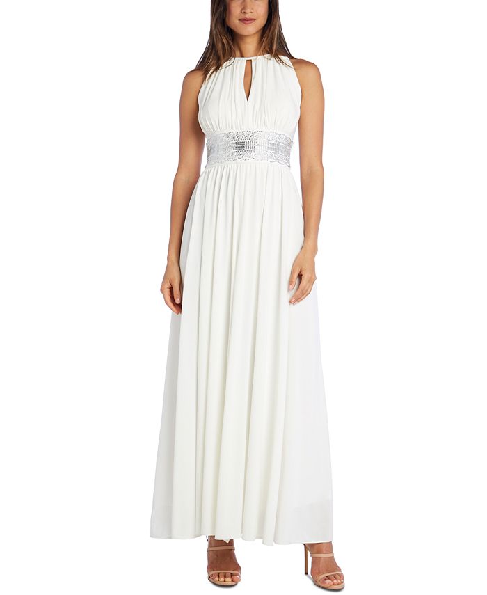 Timelessly refined| this R & M Richards halter gown flows with a keyhole cutout at the neckline and a beautifully embellished waist.| Halter neckline; Gown silhouette | Hidden back zipper closure; center back keyhole with tie closure at back of neck| Keyhole cutout at front neckline; metallic embellishment at waist| Imported|