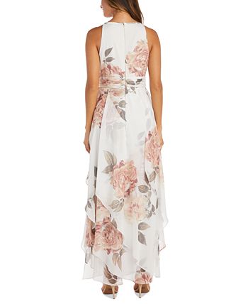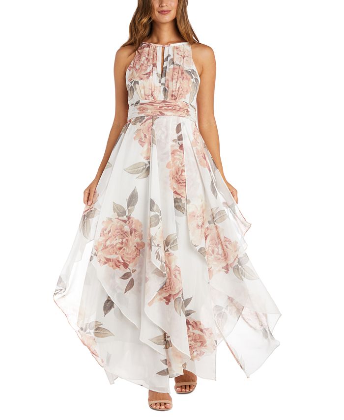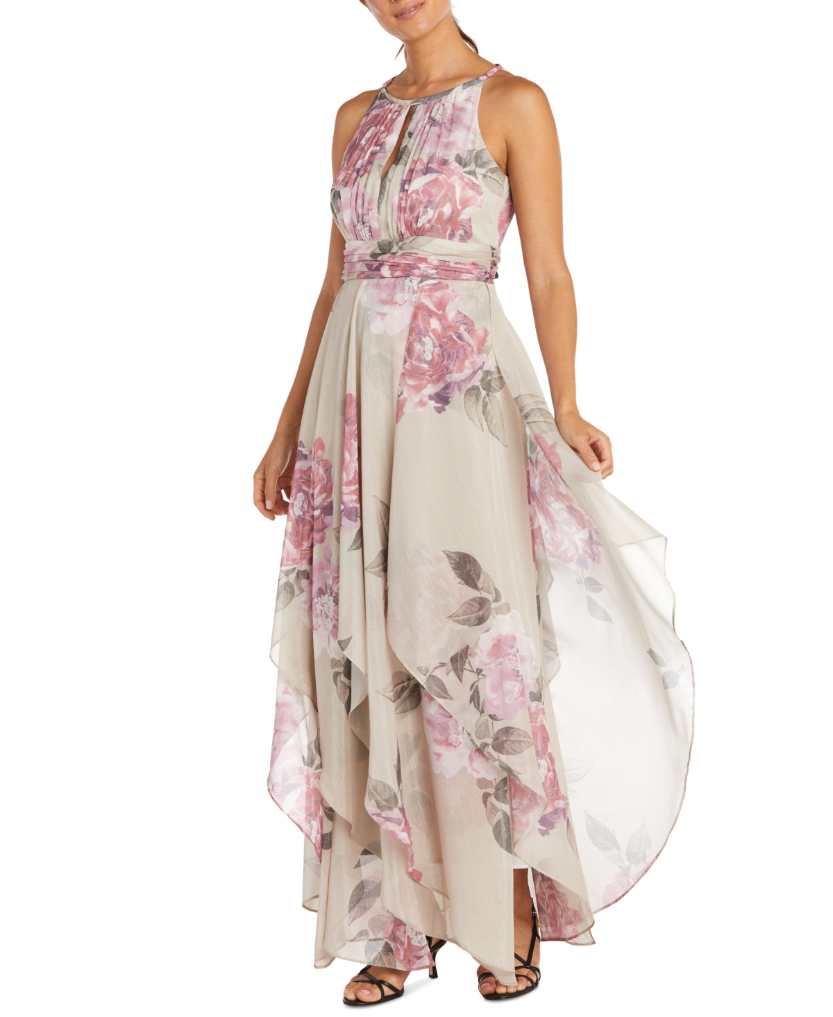 Imported|Hidden zipper at center back|Halter neckline with keyhole and ruching|Wide ruched waistband; waistline tucks release into high-low tiers|Connect with a stylist & get free expert advice online or in stores for your wardrobe| home & more. Book Now