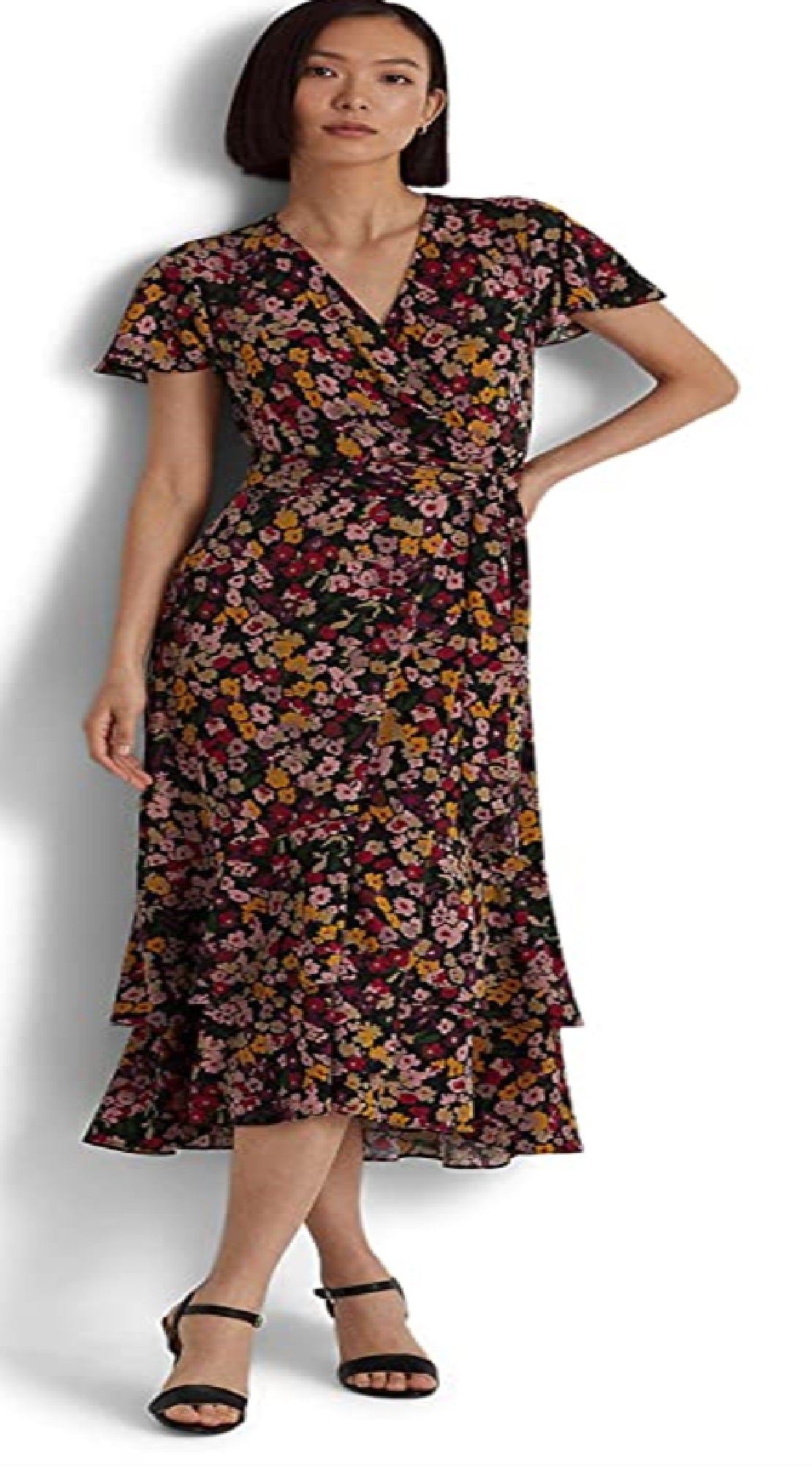 Stand out in the crowd elevating up your casual style statement wearing the Ralph Lauren Eitan Short Sleeve Day Dress| Flattering wrap silhouette| Surplice neckline| Short flutter sleeves| Self-ties at the left waist| Fluid tiered skirt| Pleating at the bodice