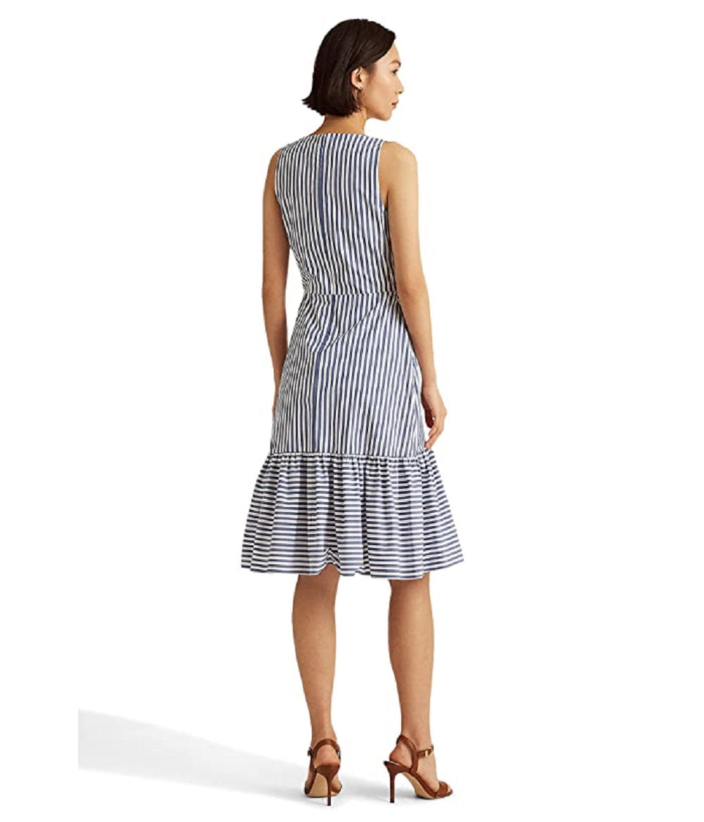 Graceful and feminine| the Ralph Lauren Striped Front Tie Crepe Dress is an instant heart-stealer| Mermaid silhouette| V-neckline and sleeveless| Tie knot on the bodice| Ruffled skirt| Zippered closure