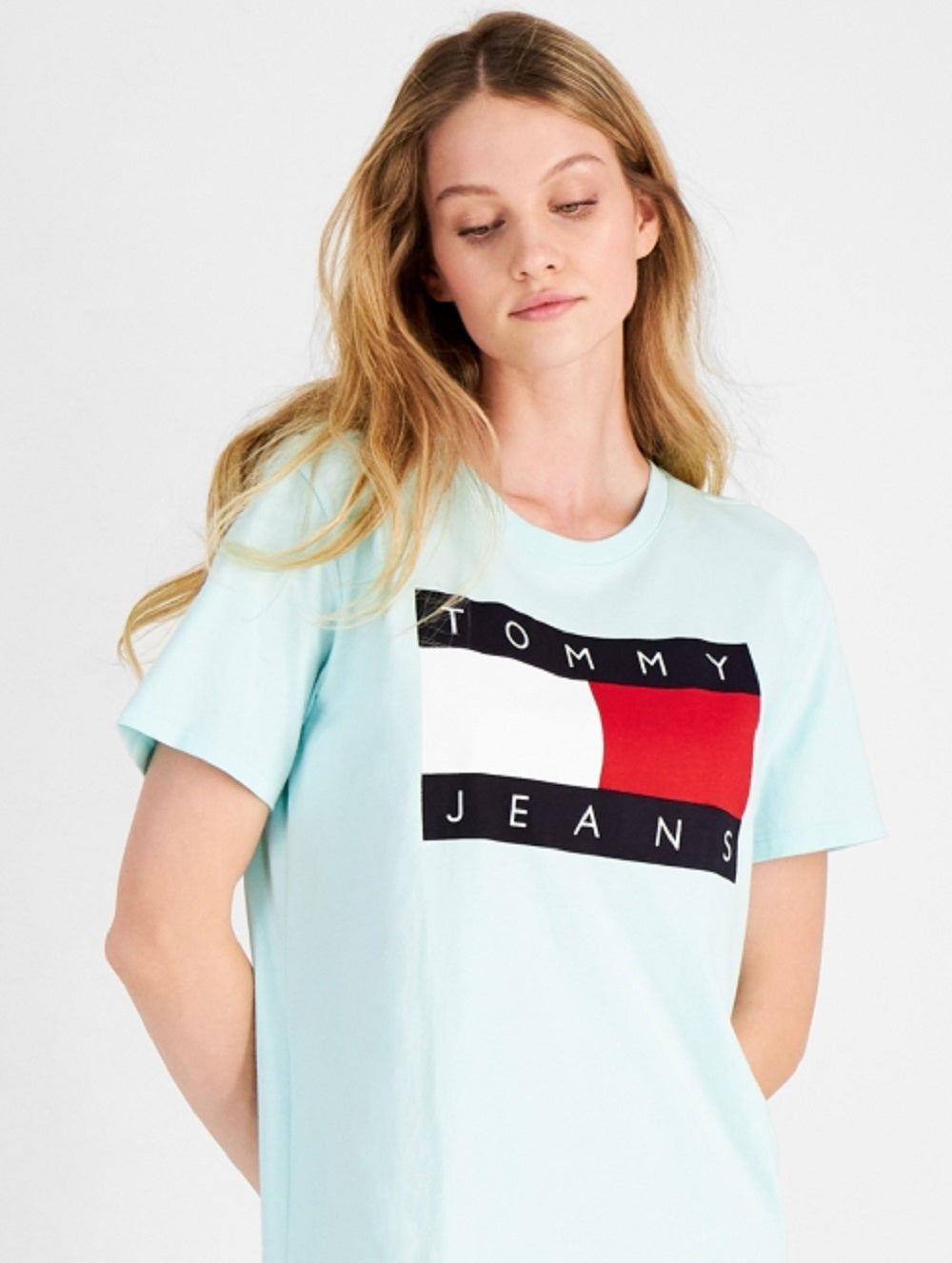 Your favorite Tommy Jeans T-shirt just got a chic upgrade in the world of comfortable and casual chic design with this short sleeve flag tee dress.| Approx. 34-1/2 long| Crewneck| Pullover styling| Embroidered flag at left sleeve| Unlined