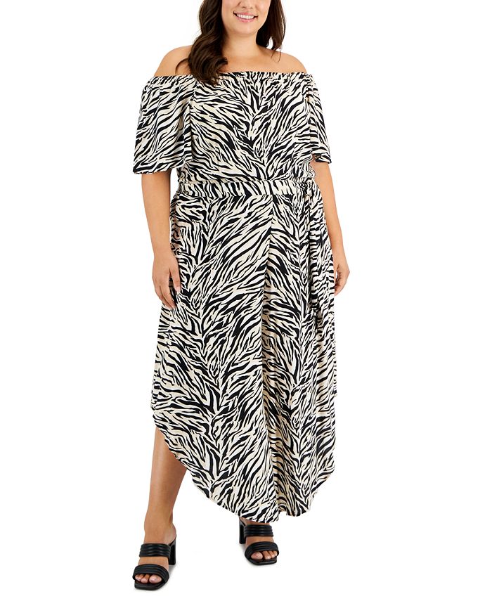 Lend a fierce feel to your look with this animal-print plus size jumpsuit from Vince Camuto.| Off-the-shoulder neckline; pull-on style | Tie detail at waist; asymmetrical hem | Polyester; lining; polyester| Machine washable| Imported