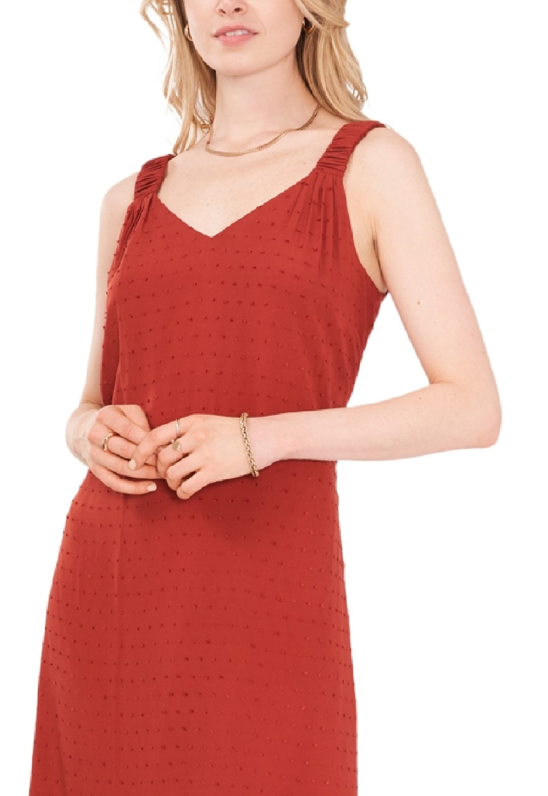 Vince Camuto's clip-dot dress is the definition of style and charm. The clip-dot texture adds depth to your wardrobe.| Ankle-length or longer casual dress| V-neck| Pullover styling| Clip-dot detail throughout| Unlined| Rayon