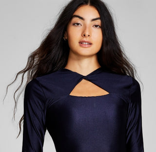 And Now This Women's Shiny Twisted Long Sleeve Thong Bodysuit Blue Size Small