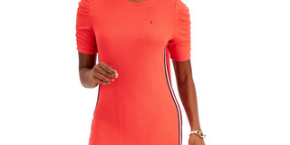 Tommy Hilfiger Women's Solid Ribbed Puff Sleeve Dress Red Size Large