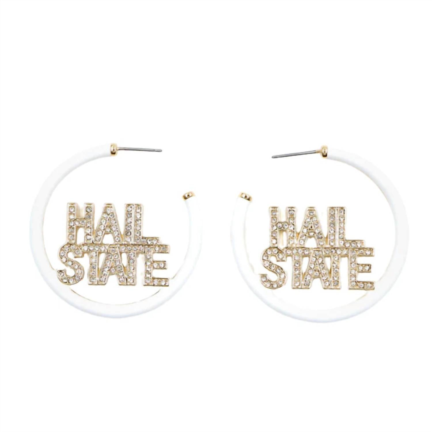 Easy and elegant earrings to complement any outfit. Introducing the Women's Mississippi State Pave Hoop Earrings by Brianna Cannon, an elegant collegiate piece designed to showcase your school spirit. These earrings stand out with their white enamel finish and pavé "HAIL STATE" detail, measuring 1.5 inches in length, and are a stylish way to support your team. For utmost longevity, store them in the included velvet pouch and avoid exposure to perfumes, chemicals, and water.
