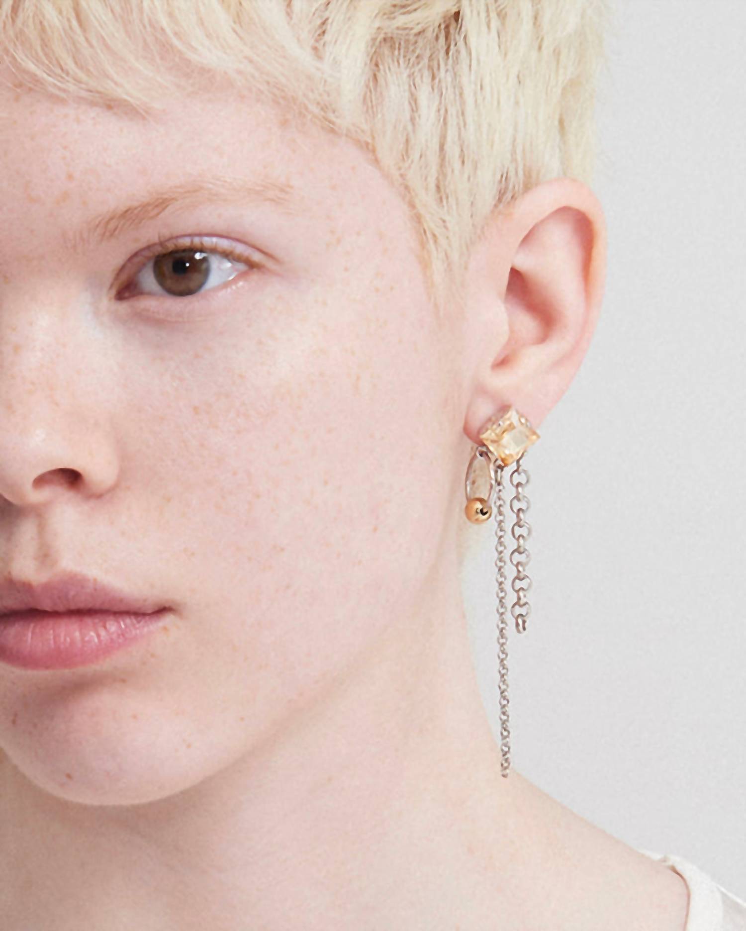 eye-catching earrings for every occasion.Designed and handmade in France from palladium-plated brass, two varying chains and a small hoop suspend from a golden shadow Swarovski crystal. The clip fastening ensures comfort without the commitment of a piercing. Sold as a single earring. Length: 3.35" (8.5cm). Details: Palladium-plated brass, golden shadow Swarovski crystal, nickel-free. Care: Avoid contact with liquids, wipe dry with a soft cloth