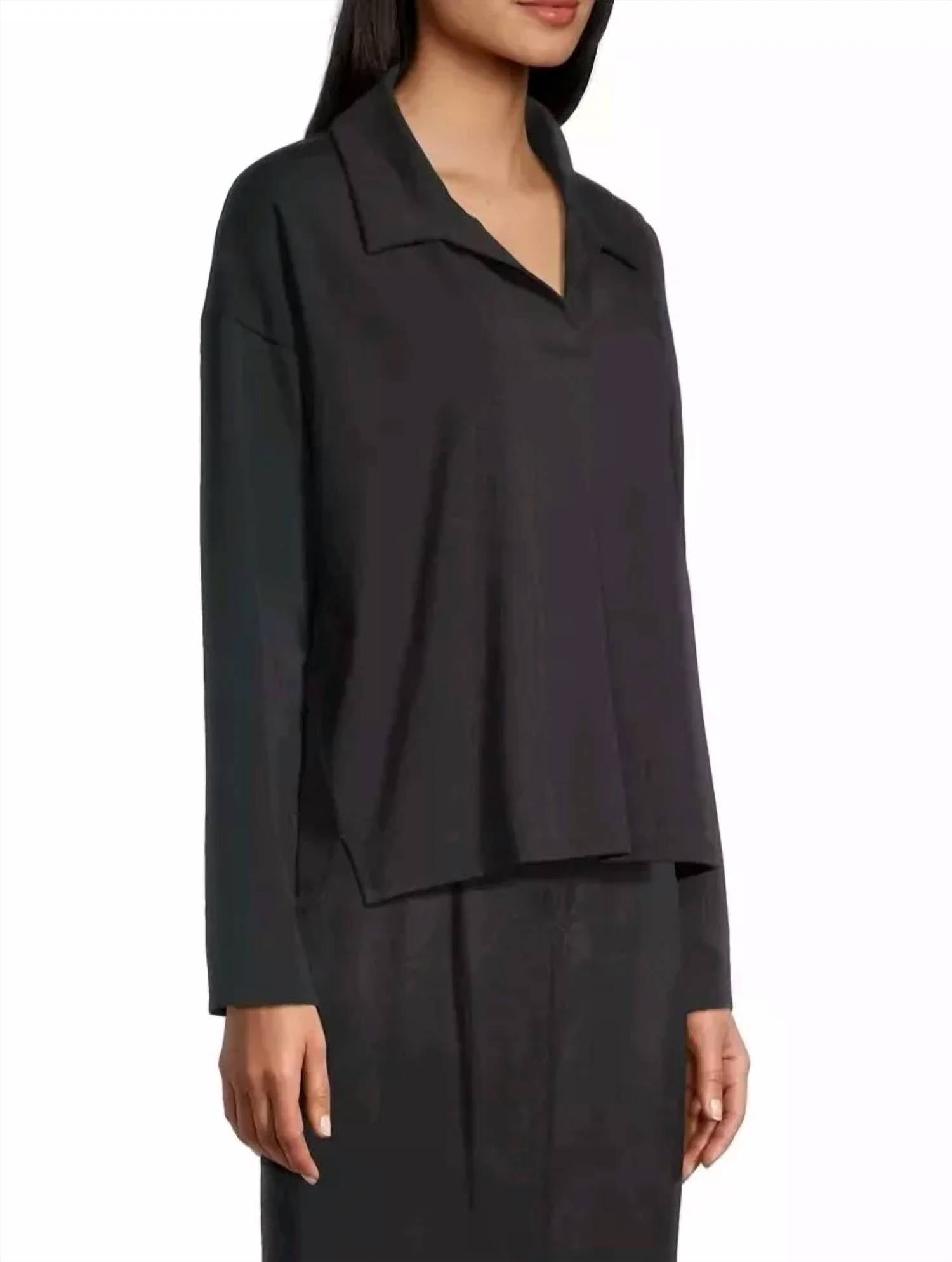 Crafted from a light cotton blend consisting of 93% cotton and 7% spandex, this top features long sleeves, drop shoulders, and a spread collar. Made in Peru with a convenient pull-on closure, it offers a comfortable fit while retaining a chic, minimalist look. For easy care, this blouse is machine washable and tumble dry friendly. Consider ordering a size down as the fit is slightly larger. Model is wearing a US size Small.