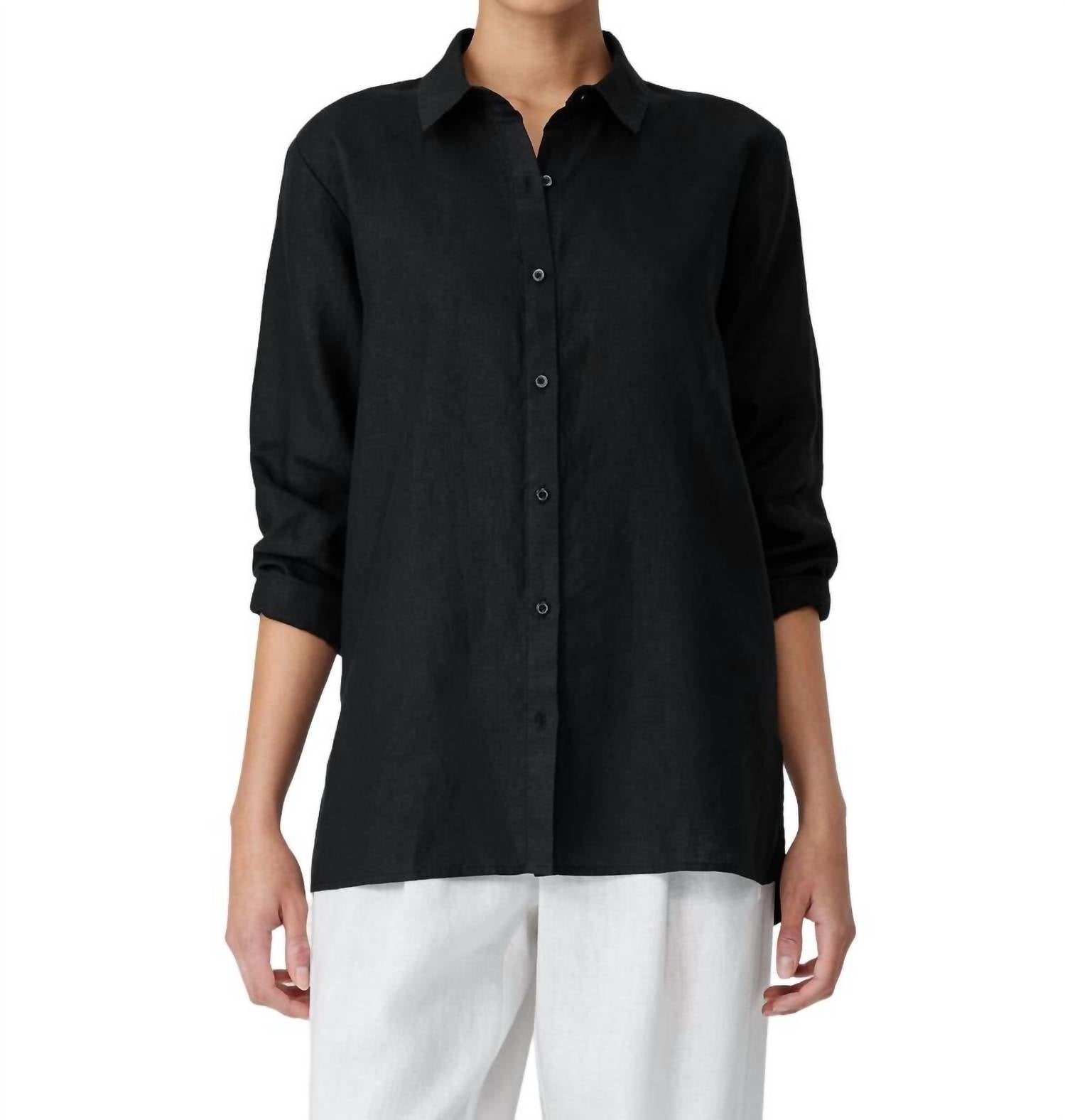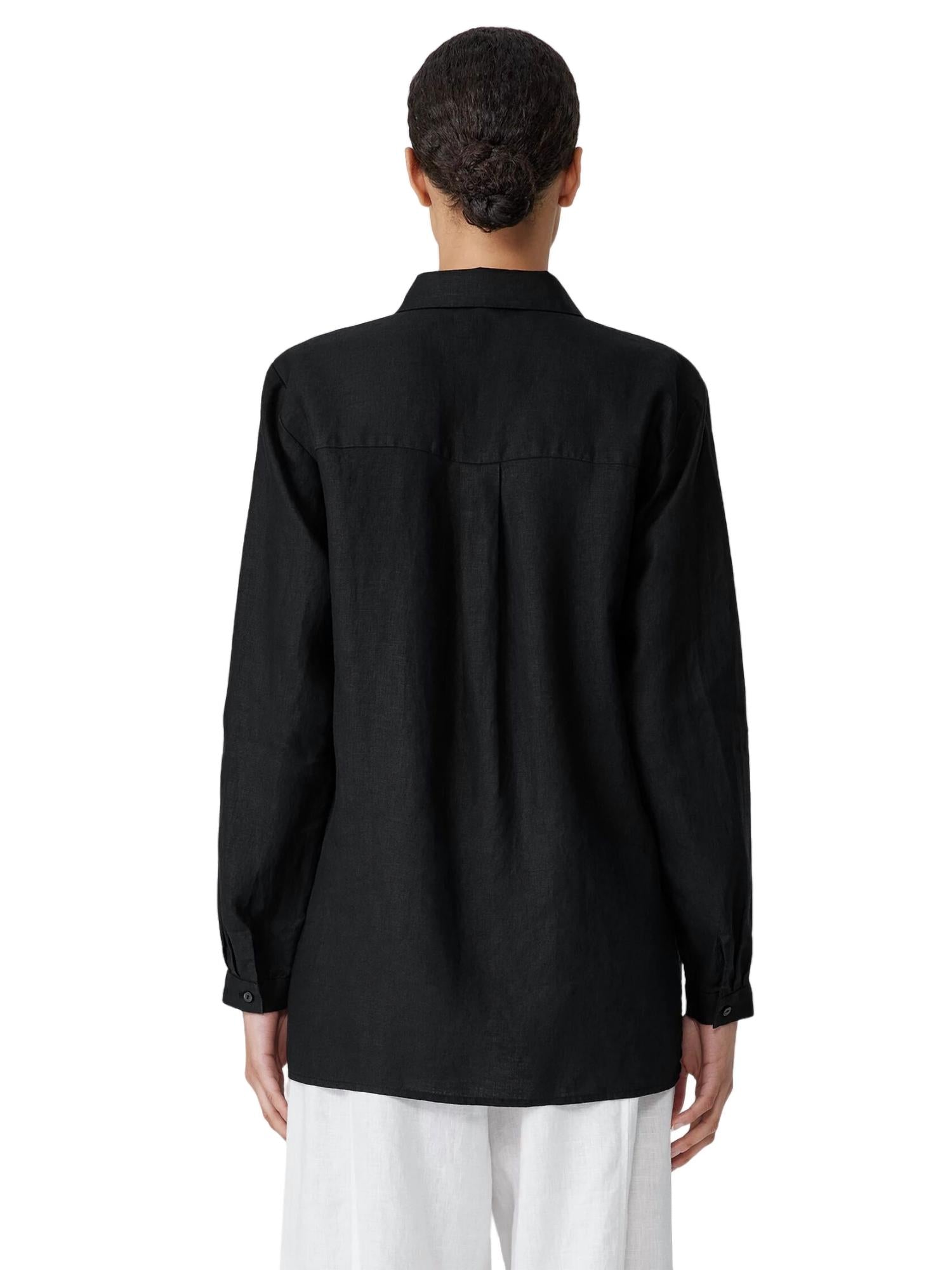 A classic button down shirt that will never go out of style.Classic collar, button front and button cuffs with double pleat. A crisp organic linen staple, updated with an uneven hem. Stepped hem with 5" side slits. Back yoke with center back box pleat. Mother-of-pearl buttons. Machine wash cold. 100% Organic Linen. Made in Indonesia.