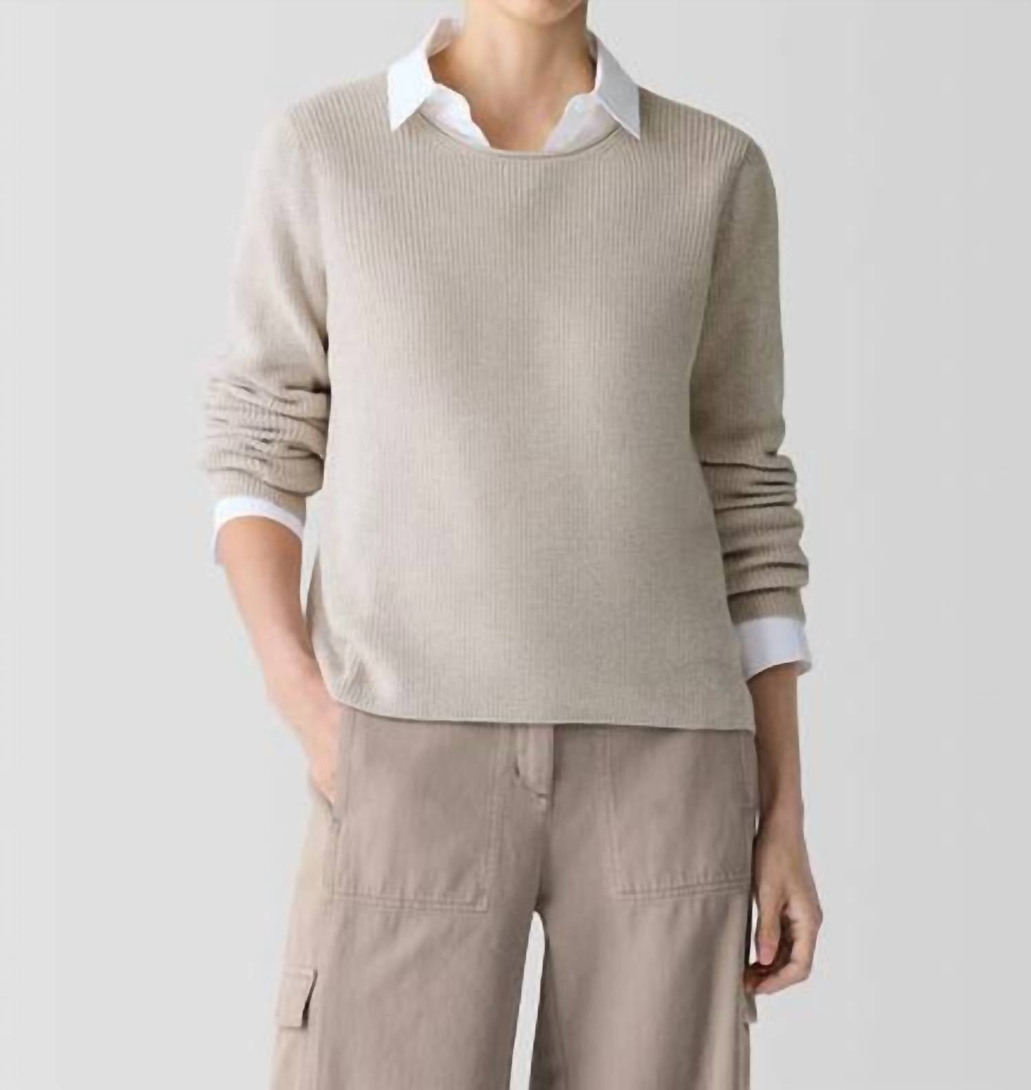 Experience the perfect blend of comfort and style with this trendy crew neck sweater, designed to effortlessly elevate your wardrobe. Pair it with your favorite denim and loafers for the perfect look. Elevate your wardrobe with the Crew Neck Sweater by Eileen Fisher, in a serene Dove hue. Crafted in Peru, it's made from 100% organic cotton, grown with regenerative farming methods for a soft, textured finish and enhanced polish. This long-sleeve sweater features a close fit at the shoulders and a wider hem, with rolled edges at the crew neckline for a refined touch. Enjoy its effortless pull-on closure and maintain its integrity by hand washing cold and laying it flat to dry. Size S measures 23 inches, while Size 1X extends to 25 1/2 inches on the body.