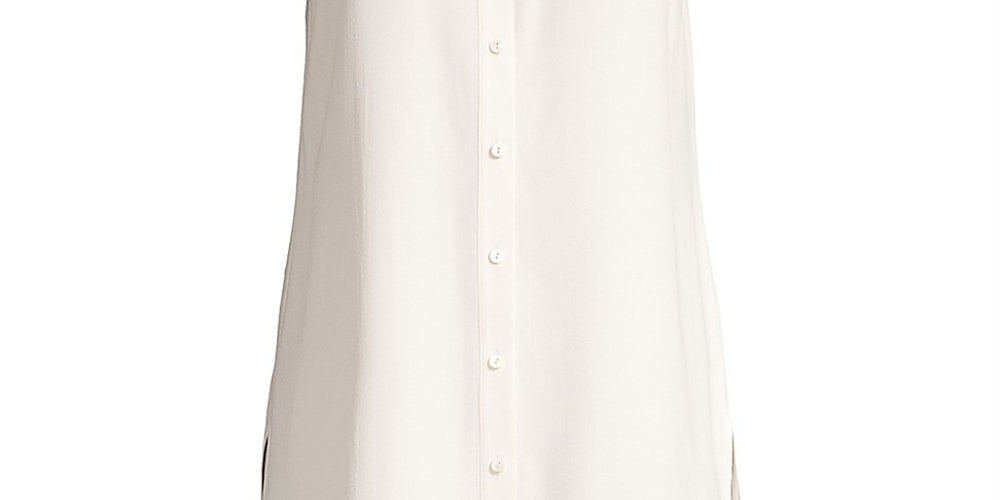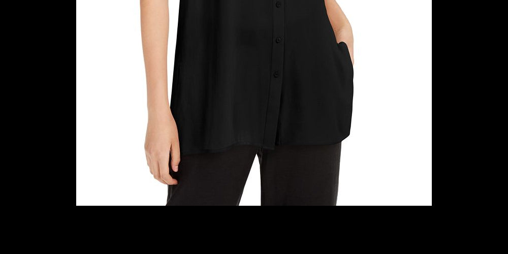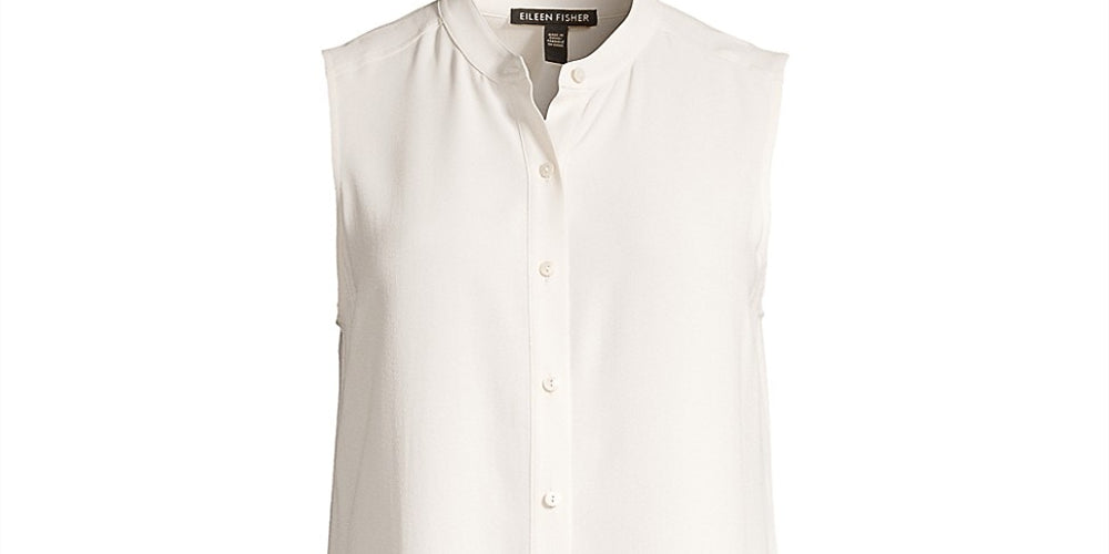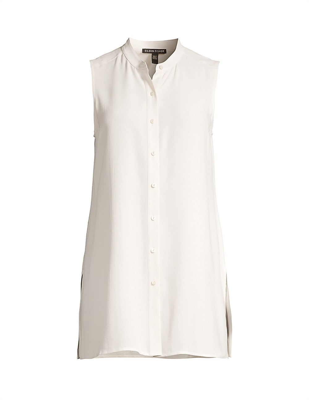 An elegant Mandarin collar tops off this luxurious silk blouse from Eileen Fisher| a sleeveless pick that flows effortlessly.| Approx. 31 long| Mandarin collar; front button closures| All silk| Machine washable| Imported
