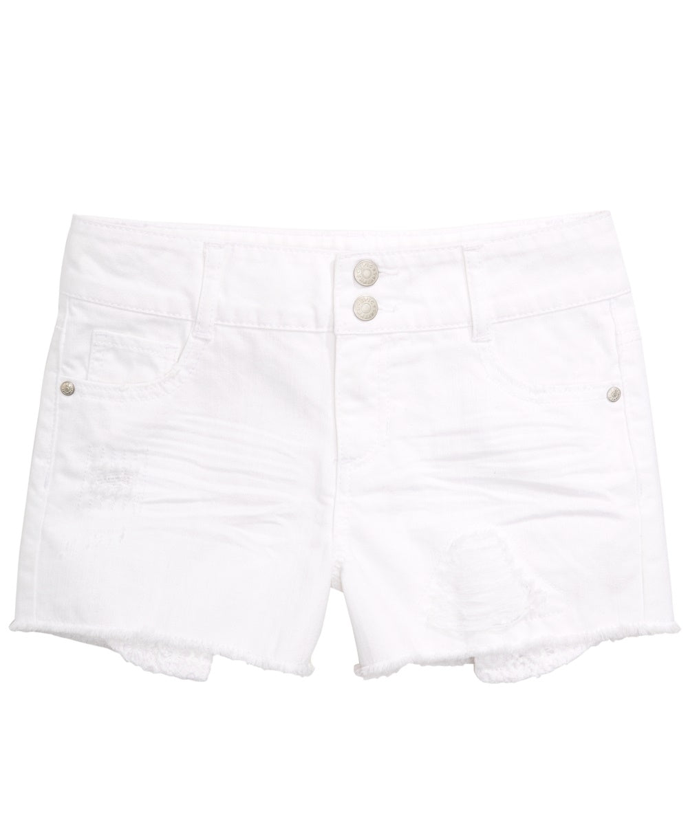 Zip fly with double button closure; belt loops|Classic 5-pocket styling|Distressing details at front|Frayed hems; embellished trim at visible pockets|All cotton