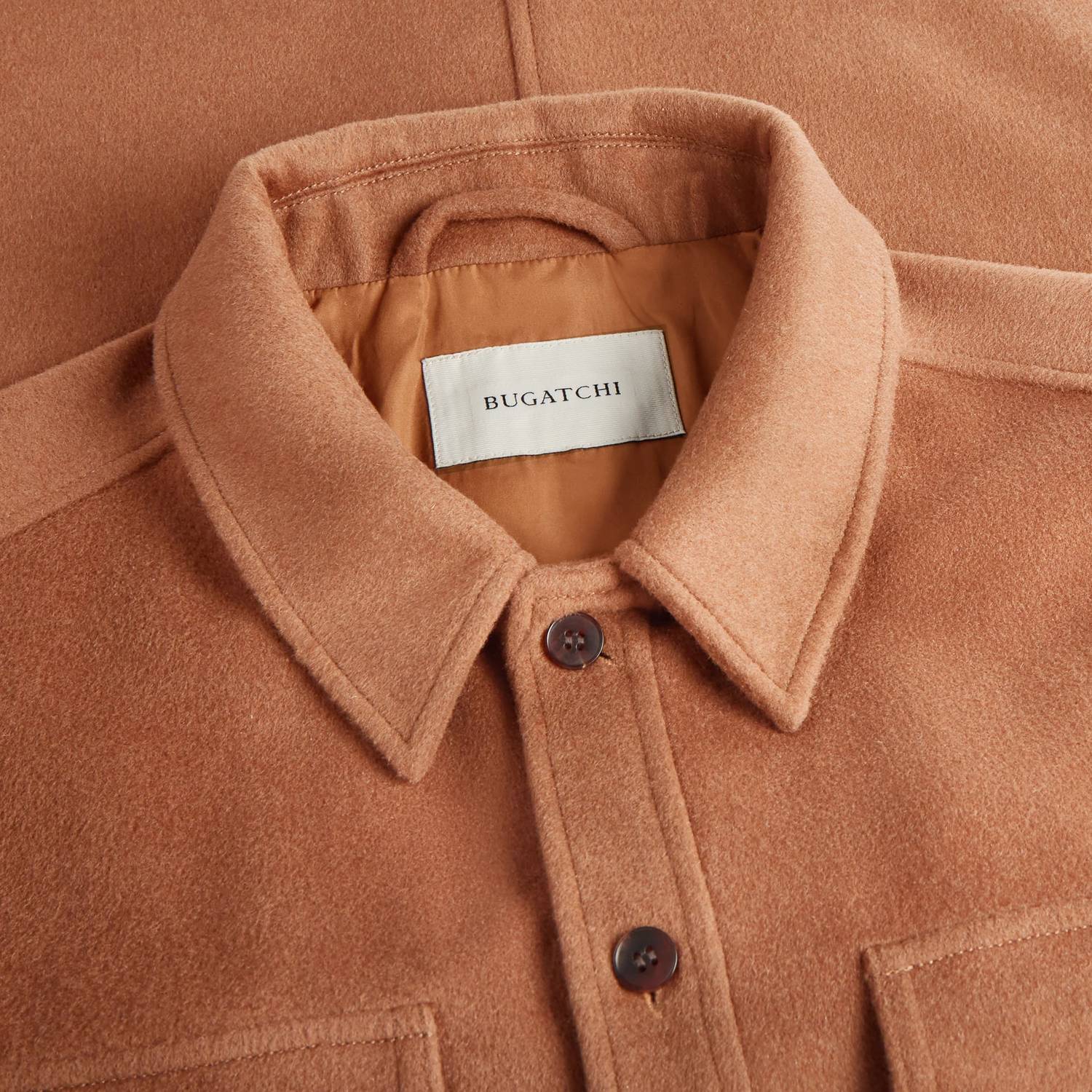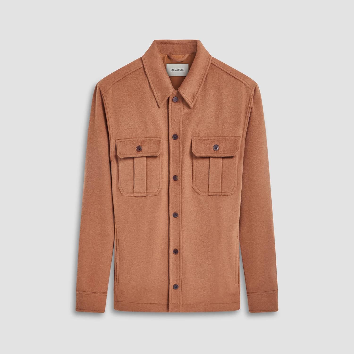 The Bugatchi Uomo Wool Cashmere Shirt Jacket in Cinnamon is an elegant choice for men seeking warmth and style. Featuring long sleeves, this jacket is crafted from a luxurious blend of 53% wool, 32% polyester, 6% cashmere, 5% nylon, and 4% other fibers, ensuring both softness and durability. Designed as a lightweight jacket with a classic collar and full button closure, it is fully lined and incorporates both chest flap pockets and side seam pockets for a sleek silhouette. Made for cooler seasons, this versatile piece requires dry cleaning to maintain its high-quality finish.