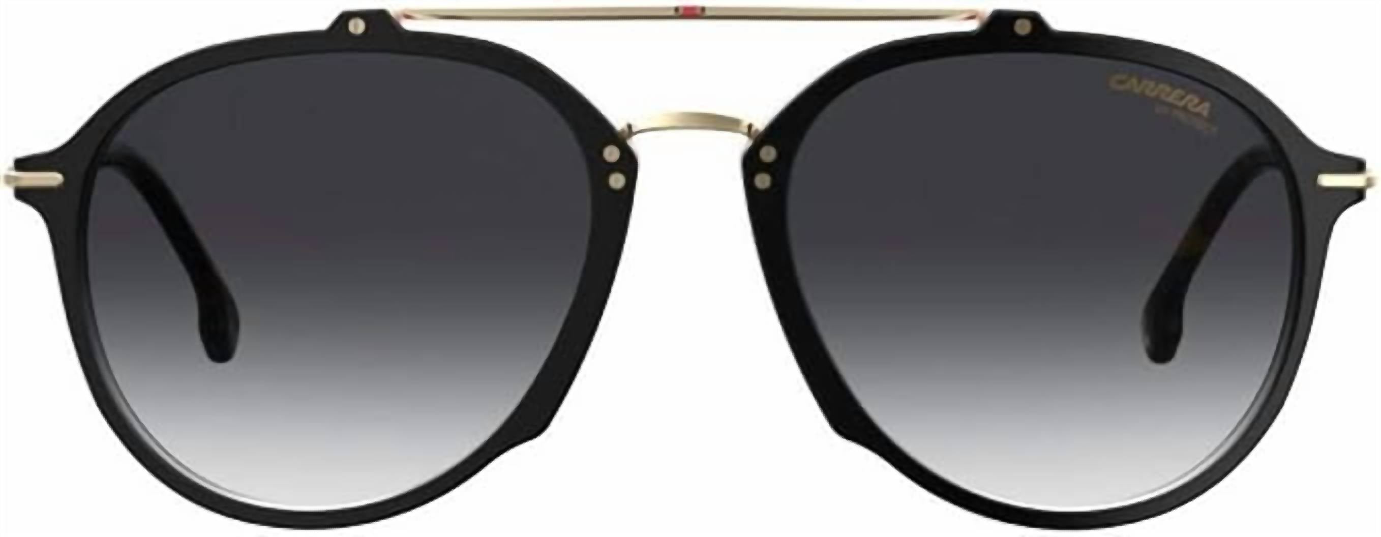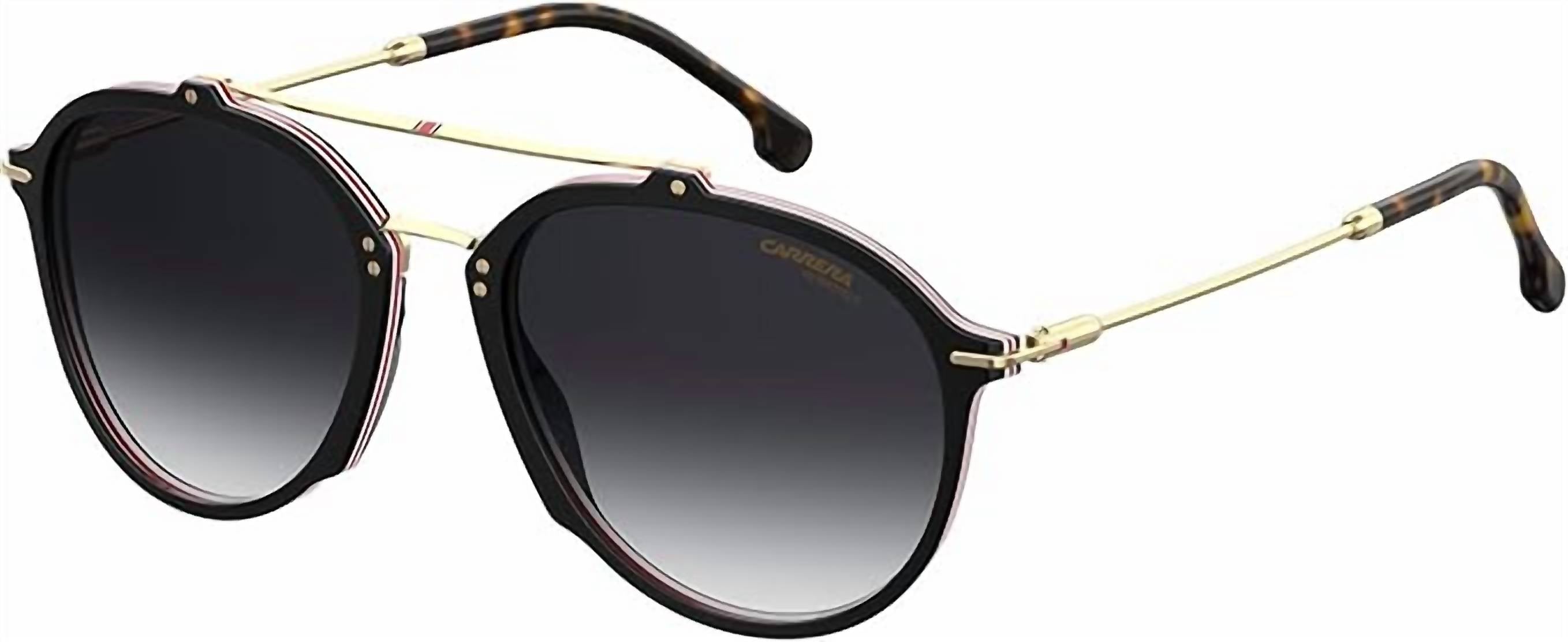 Introducing the Unisex Aviator Sunglasses by Carrera, featuring an iconic panto optic frame for a timeless look. These full rim frames securely enclose the lens, offering both style and durability. Designed for comfort with a snug fit on the ears and nose, they provide complete UV400 protection. Available in a striking Black Havana with dark grey gradient and gold accents.