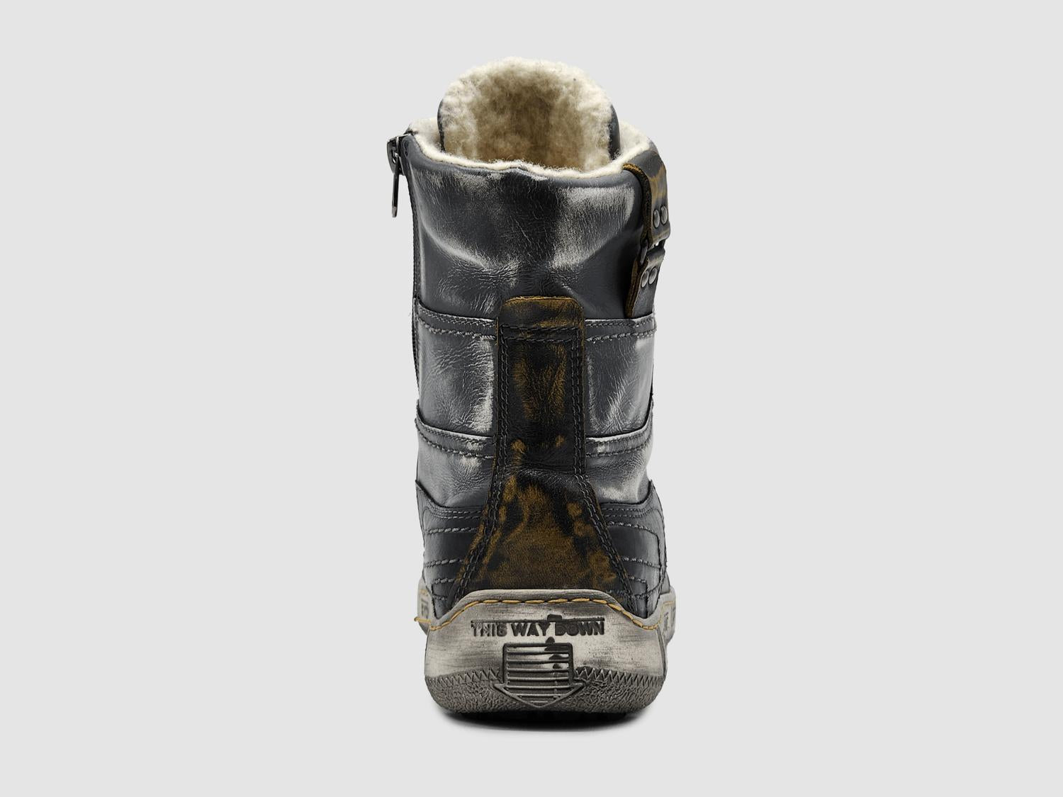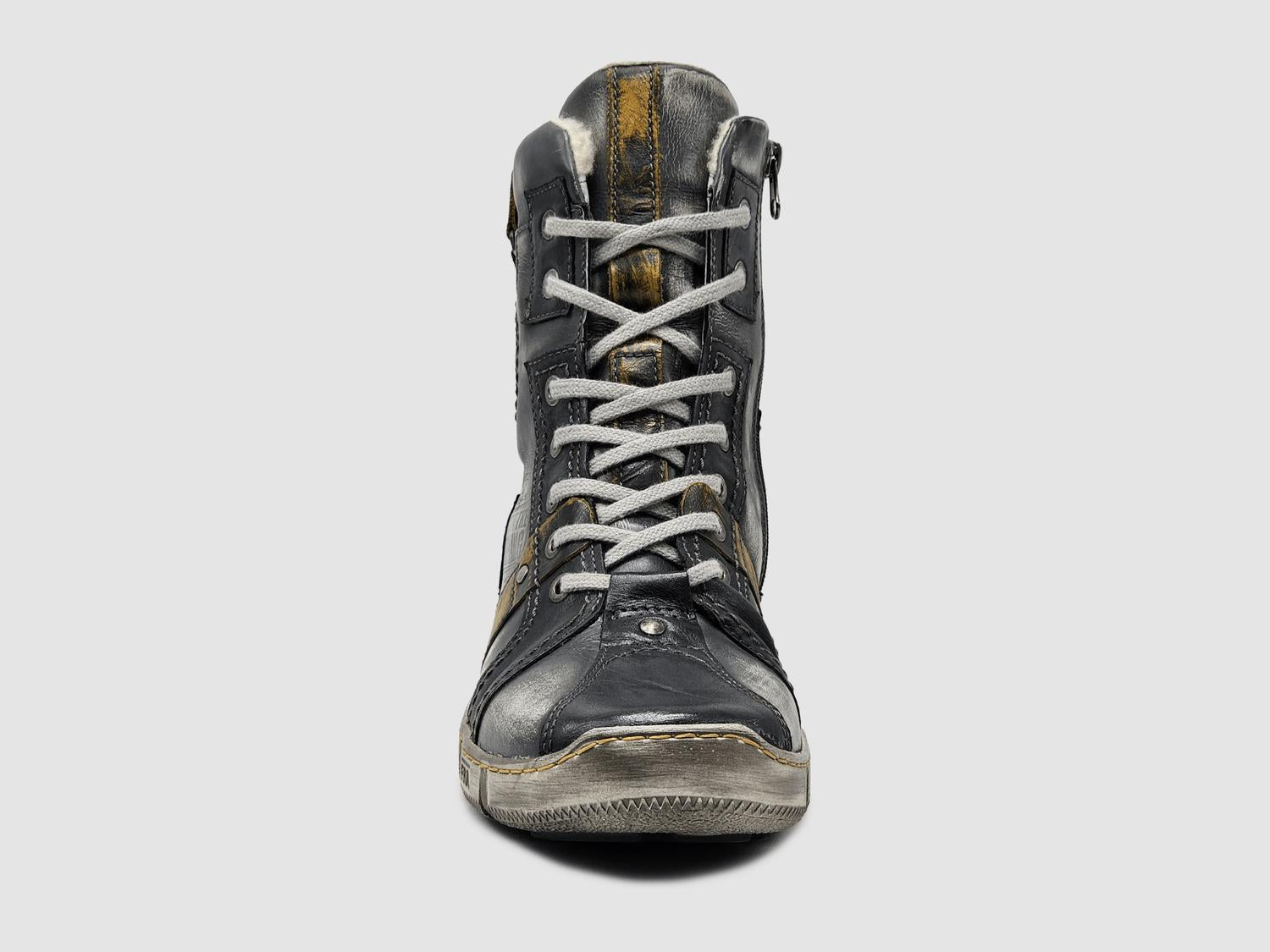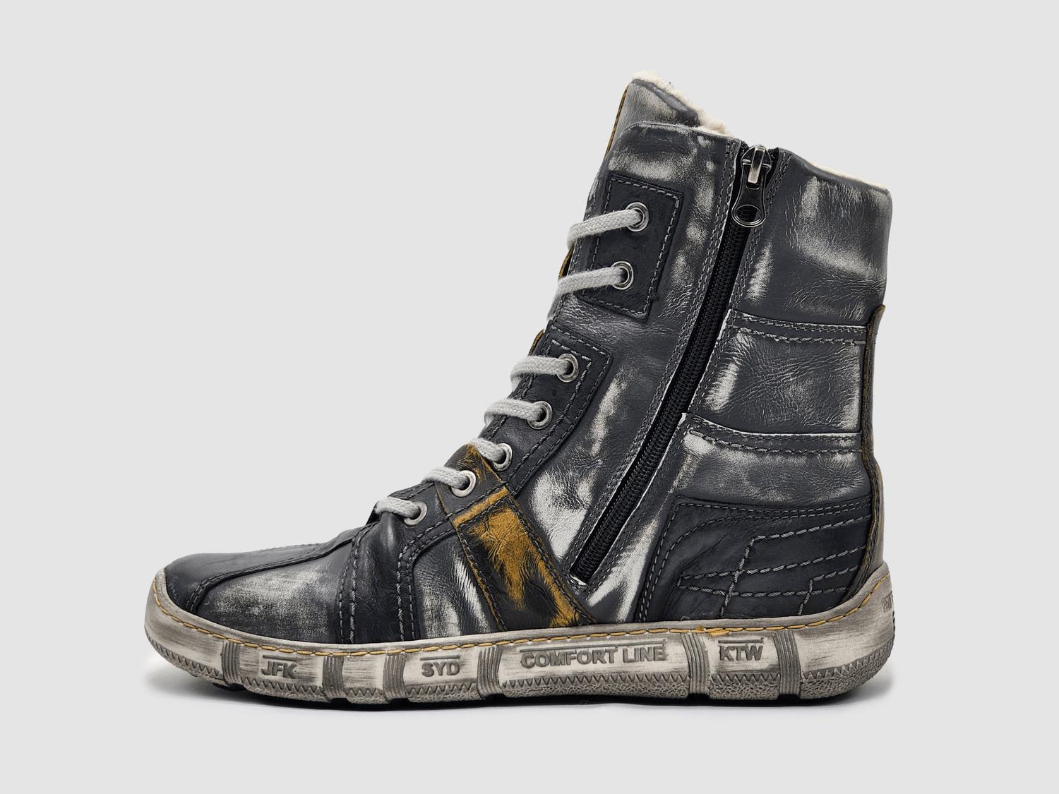 Stylish grey with eye-catching yellow accents. Expertly handcrafted with high-quality leather. Feature a thick wool lining for exceptional warmth during colder months. Convenient zip-up closure ensures ease of wear, complemented by a round toe and platform heel for added comfort. Made in Poland.