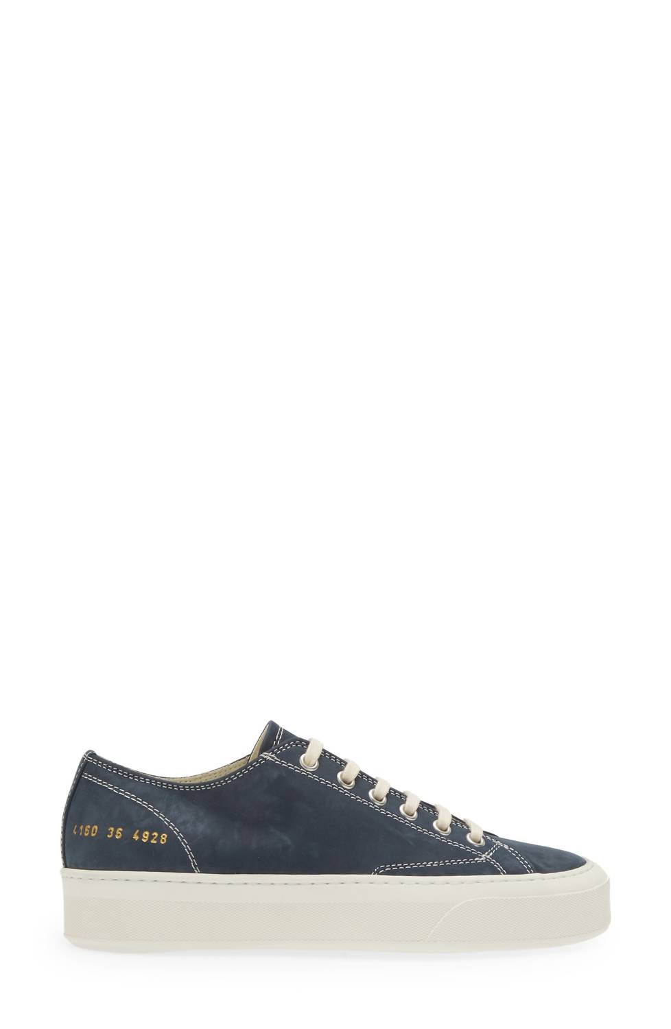 Cute, functional, and comfortable. These sneakers check all the boxes. Step into style with the Women's Tournament Low Sneaker by Common Projects, an essential addition to your streetwear collection. These navy sneakers feature a classic round toe and a flat heel under 1”, ensuring comfort and versatility for your spring vacation outings. Made in [Country of Origin]. Ideal for adult women, these sneakers effortlessly blend style and practicality.