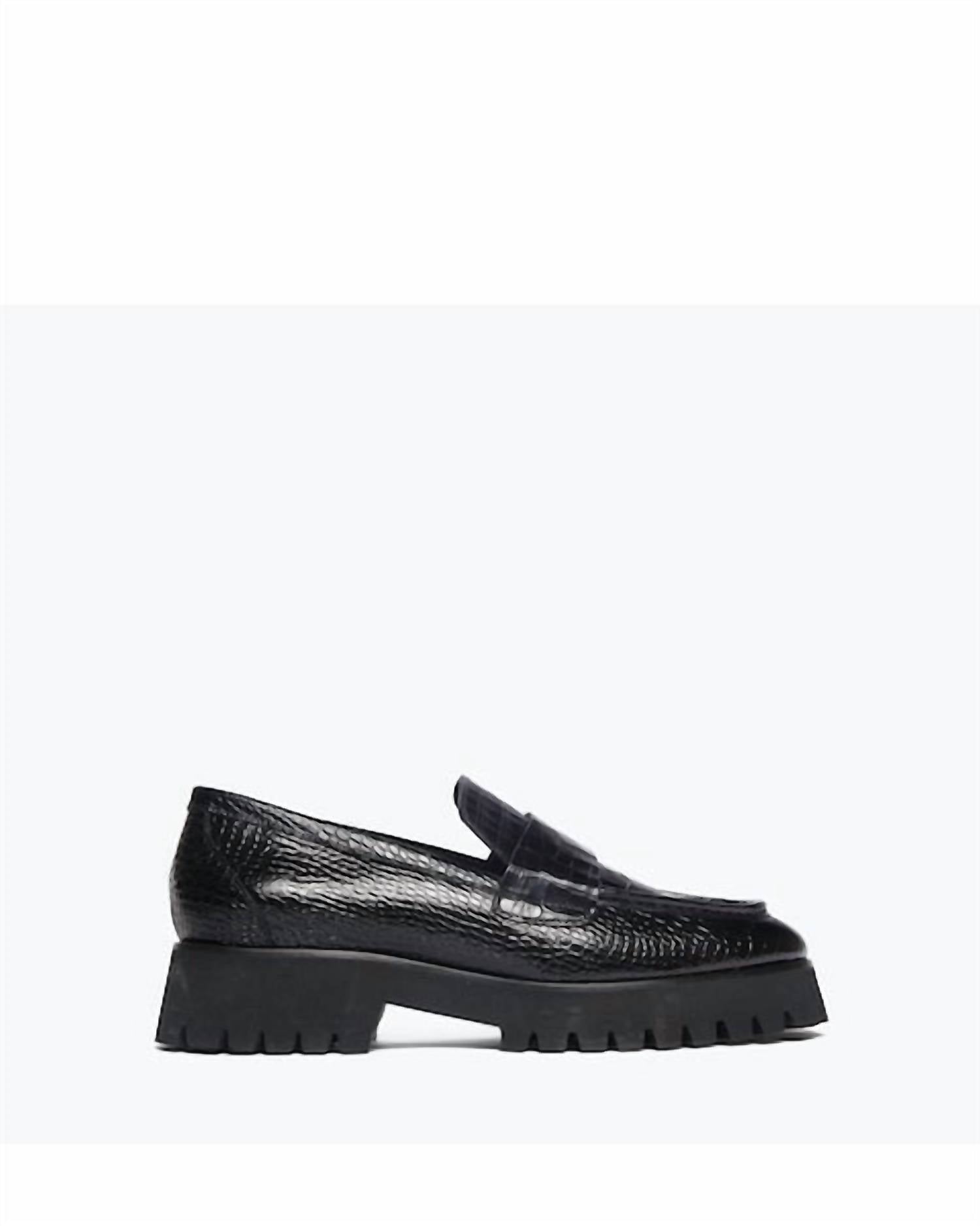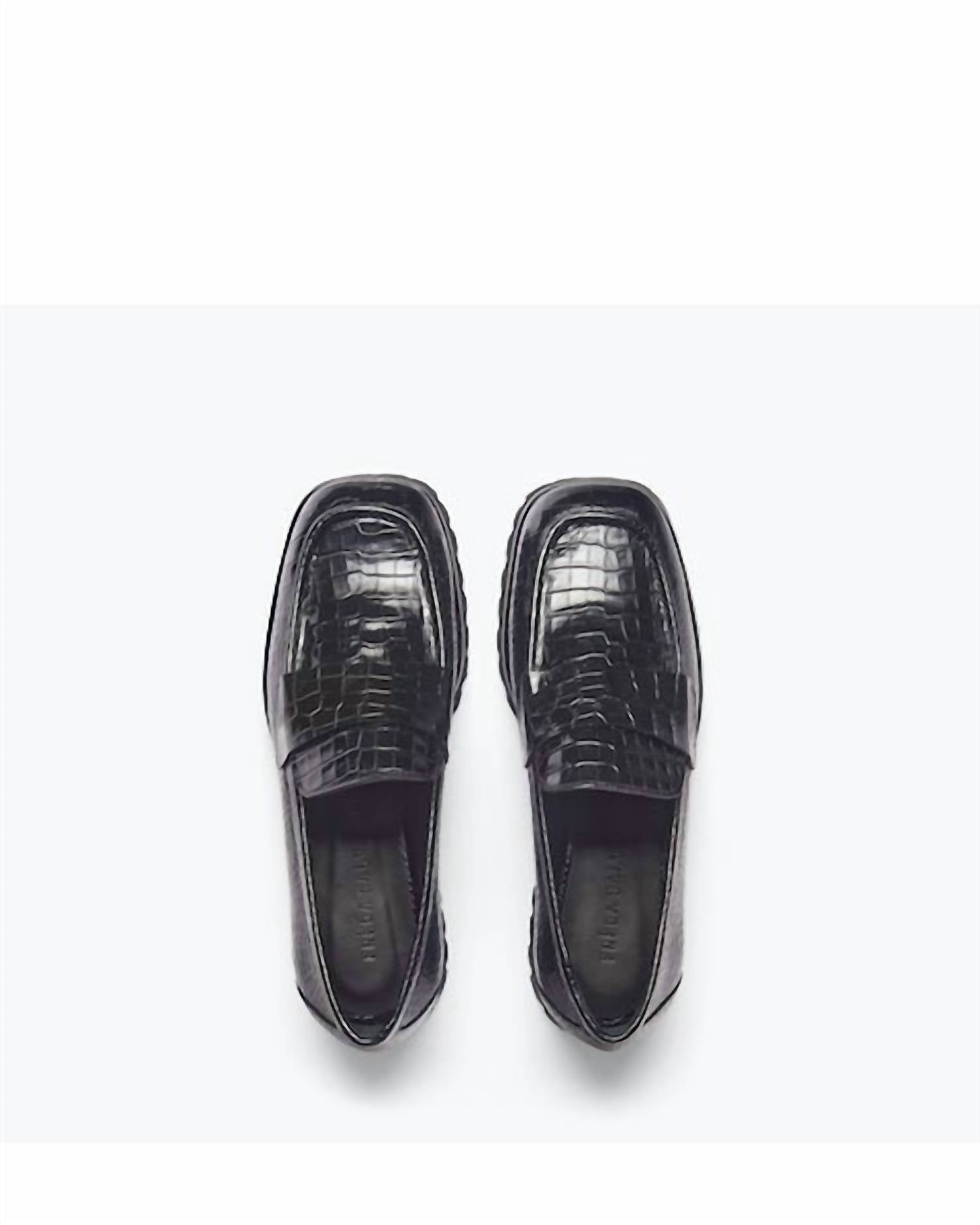 Step up your style with the Women's Hana Croc Embossed Loafers by FREDA SALVADOR, a chic fusion of classic and contemporary design. Featuring a statement chunky heel and a round toe, these loafers are handcrafted from black embossed 100% Italian leather, lined with 100% Spanish leather, ensuring durability and comfort. The tonal rubber EVA lug sole with a 1.5" heel and 1" platform provides a modern edge, perfect for both dressing up and down. Ideal for workwear or church occasions, these low-heeled loafers are a must-have for the spring season.